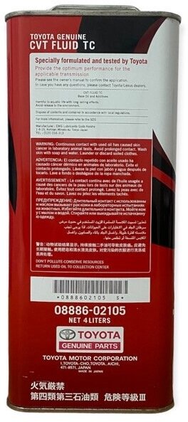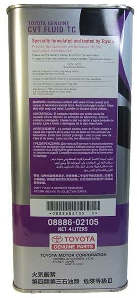 OEM Approvals: Ford CVT23, Ford WSS-M2C 928-A, Ford WSS-M2C 933-A, Lexus Type T-IV, MB 236.20, Mazda TFF CVT Fluid TC, Mini Cooper CVT, Nissan NS-1, Subaru i-CVTF, Suzuki S-CVT Oil, Toyota CVT FE, Toyota CVTF, Toyota CVTF FE, Toyota CVTF TC, Toyota TC, TOYOTA CVT TC