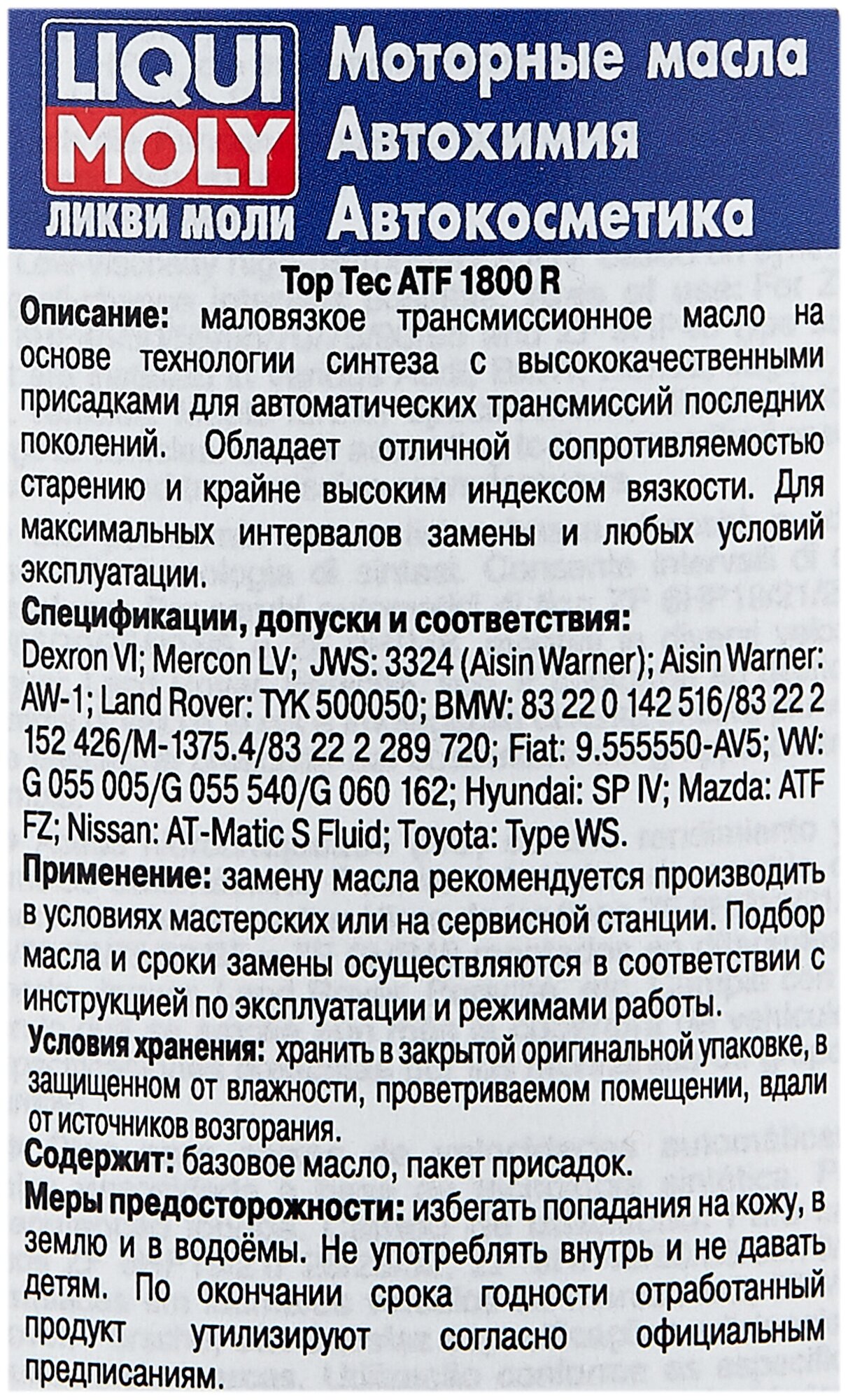 Aisin Warner, FIAT 9.55550-AV5, GM Dexron VI, HYUNDAI SP-IV, Land Rover TYK500050, Mazda ATF FZ, Mercon LV, Nissan Matic-S, Toyota WS, VW G 055 005, VW G 055 540, VW G 060 162