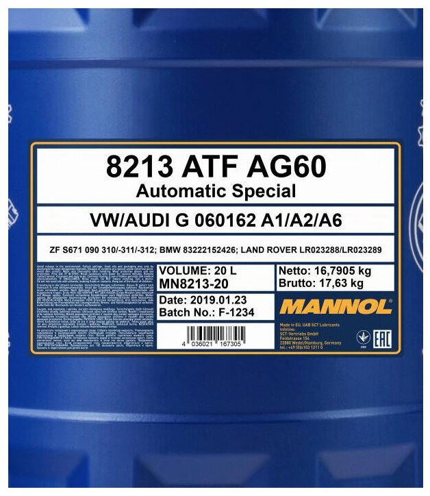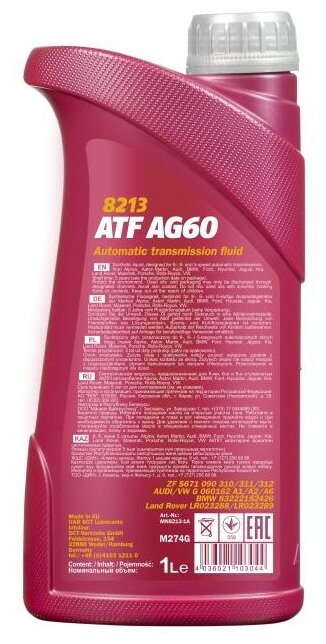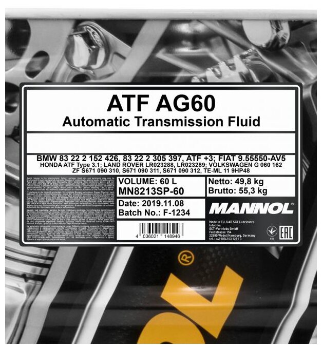Type: gearbox, automatic transmission, Transmission oils, composition: synthetic, API standard: Automatic Special ATF AG60, SAE viscosity: Not subject to SAE classification, gearbox type: automatic