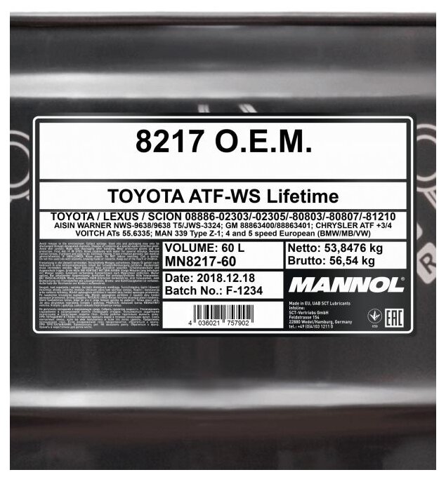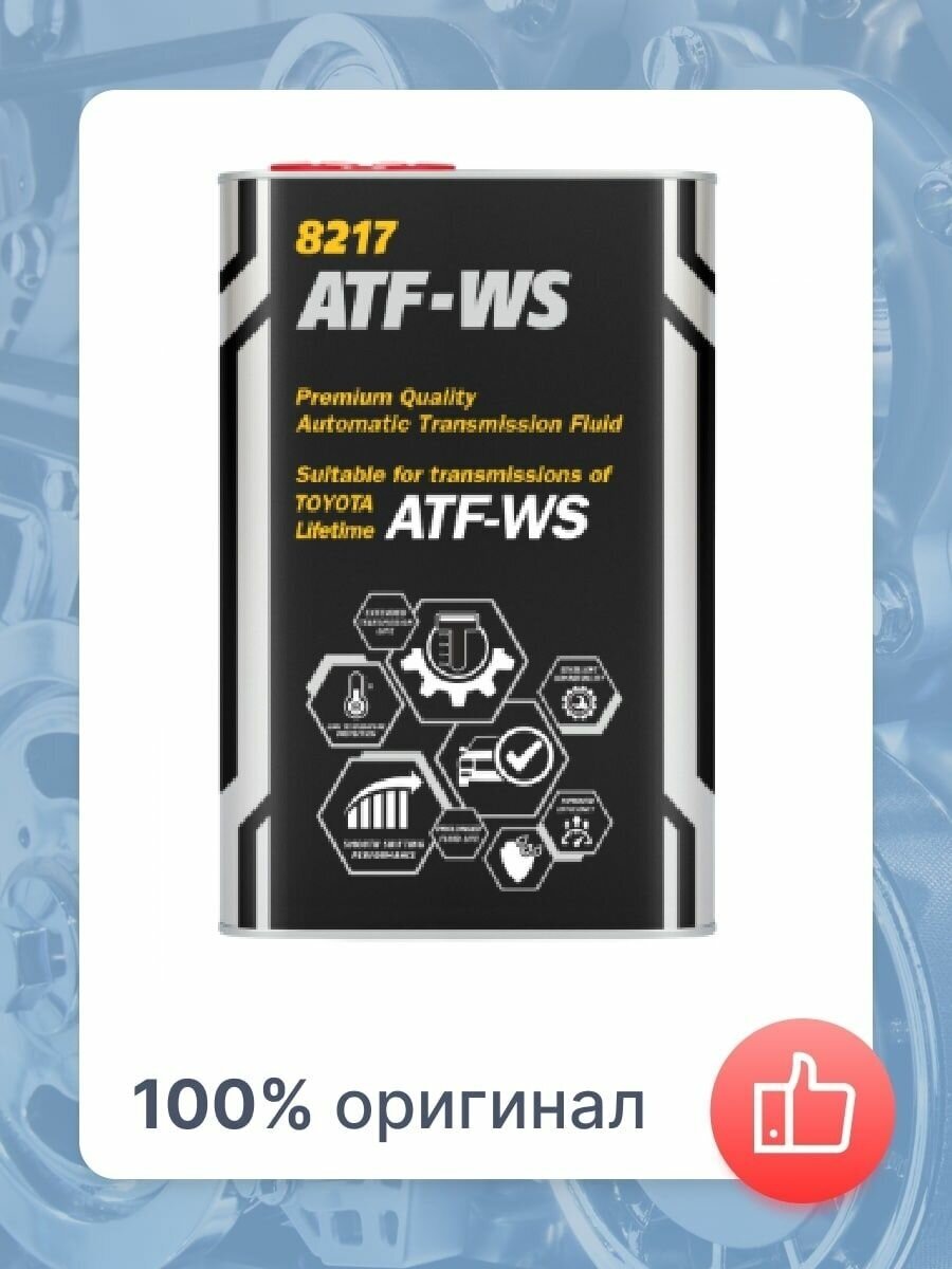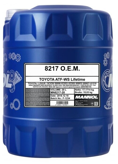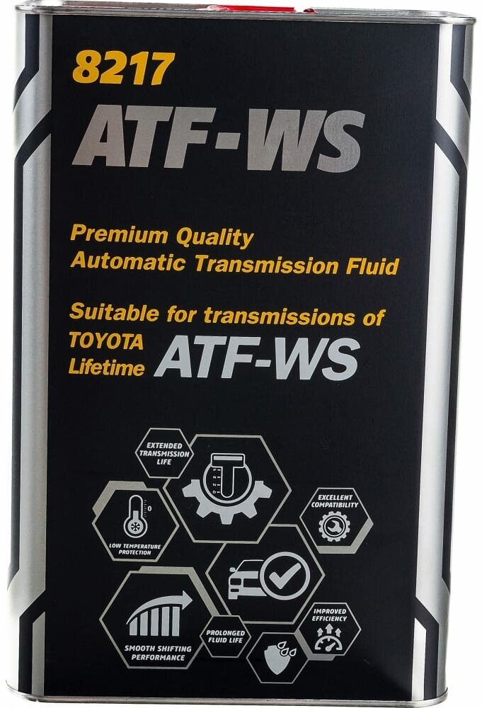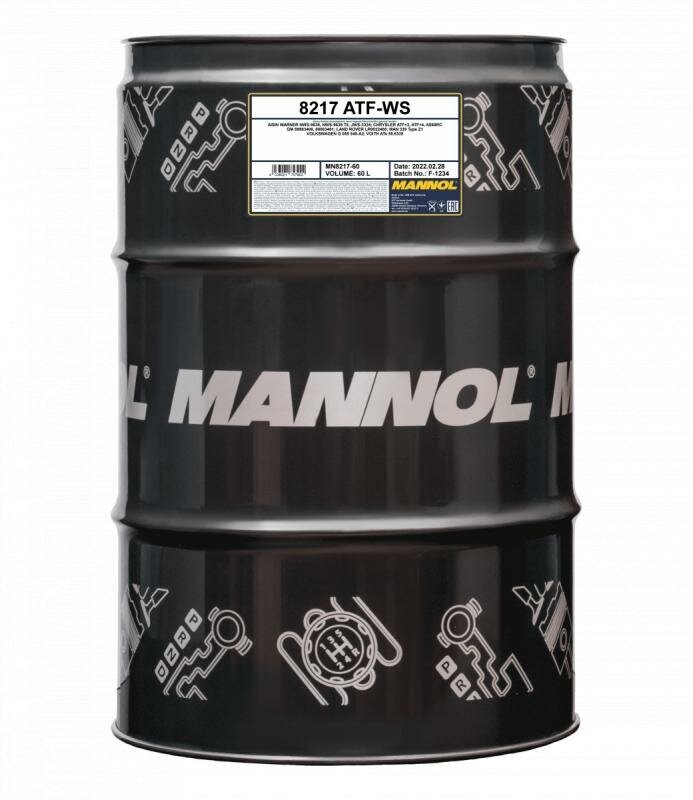 Aisin Warner, Chrysler ATF +3, Chrysler ATF +4, Hyundai NWS-9638 T5, JWS 3324, MAN 339 Type Z1, Toyota WS, VW G 055 540 A2, Voith H55.6335, CHRYSLER ATF+4, Chrysler, GM, Land Rover LR0022460, MANNOL ATF-WS 8217, Toyota 08886-02305, Toyota ATF WS, Voith 55