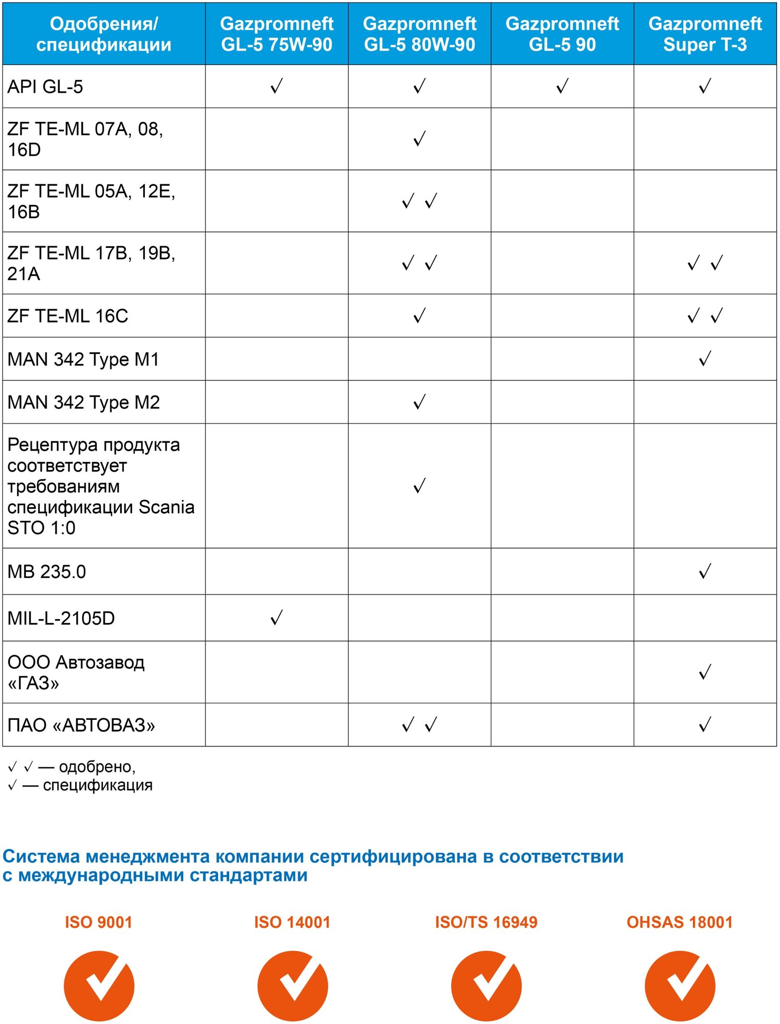 MAN 342, MAN 342 Type M1, MB 235.0, ZF TE-ML 17B, ZF TE-ML 19B, ZF TE-ML 21A, AvtoVAZ PJSC, API GL-5, GL-5, ZF TE-ML 16C, ZF TE-ML 21, ZF TE-ML 21A ZF TE-ML 16C, Avtozavod GAZ LLC, Avtozavod GAZ LLC, AVTOVAZ PJSC