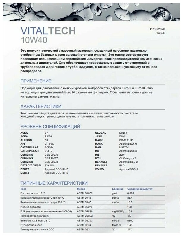SAE viscosity grade: 10W-40, oil type: semi-synthetic, vehicle type: trucks and special equipment, fuel type: gasoline, diesel, API standard: CI-4, SL, ACEA standard: E7, A3, B4, engine type: four-stroke , for turbocharged