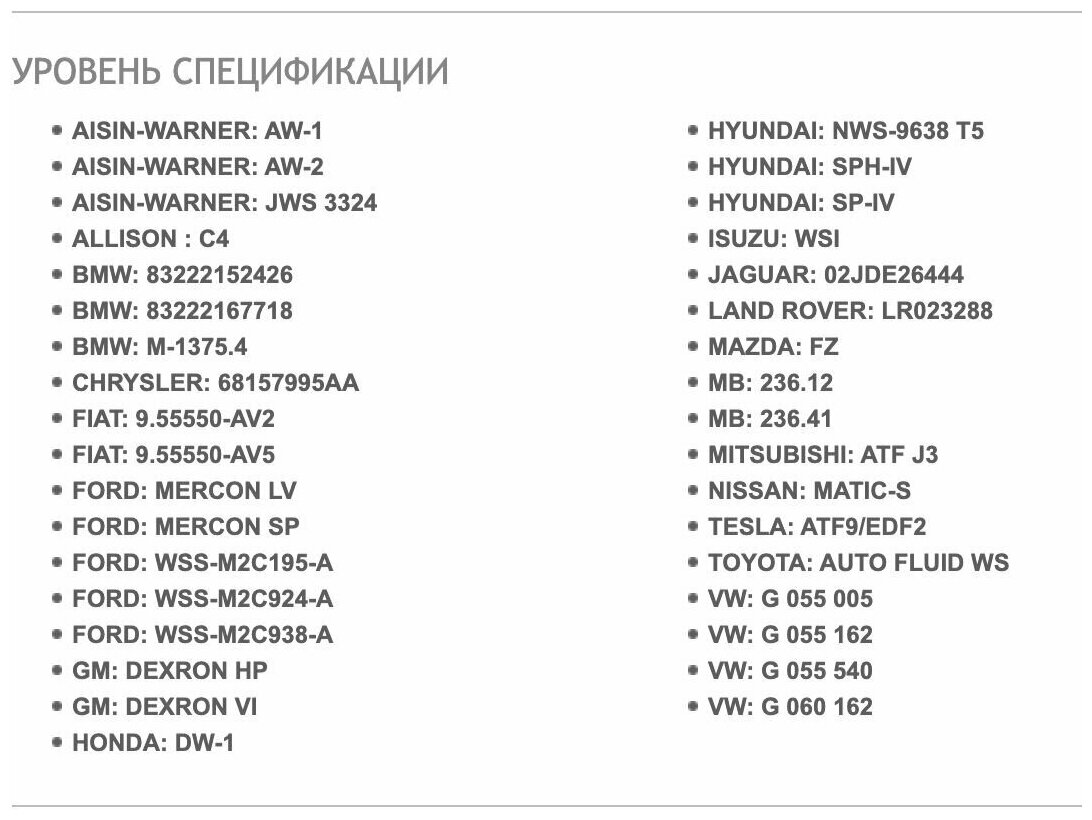 OEM Approvals: Aisin AW JWS 3324, Aisin Warner, BMW M-1375.4, FIAT 9.55550-AV2, FIAT 9.55550-AV5, Ford MERCON SP, Ford Mercon LV, Ford Mercon V, Ford WSS-M2C 924-A, HYUNDAI SP-IV, Honda: DW-1, Hyundai NWS-9638 T5, Hyundai SPH-IV, JWS 3324, Kia SPH-IV, MB 236.12, Mazda A