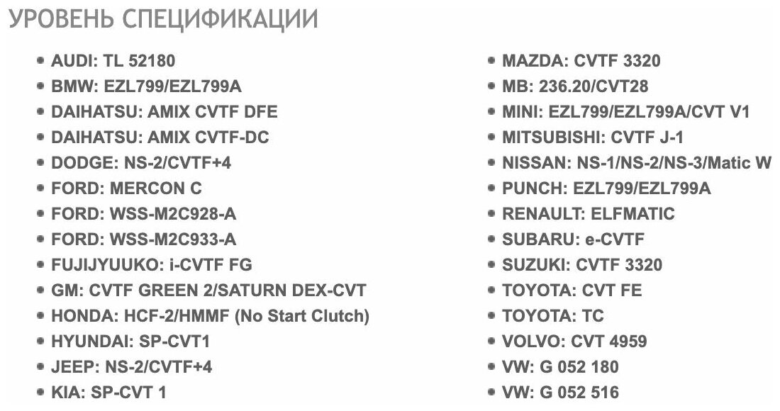 BMW CVT EZL 799A, Daihatsu Amix CVTF-DC, Honda CVT HCF-2, Mazda CVTF 3320, Mazda TFF CVT Fluid TC, Mercon C, Toyota CVT FE, VW TL 52180, CVTF Fluid FE, CVTF Fluid TC, HYUNDAI SP-CVT 1, Infiniti Matic C, KIA SP-CVT 1, Nissan CVT Fluid NS-2, SUZUKI CVT 3320