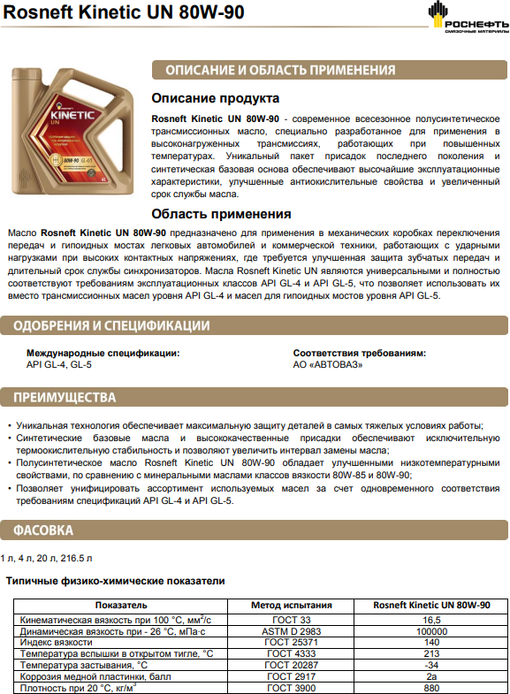 Rosneft Kinetic UN 80W-90 oil is intended for use in manual gearboxes and hypoid axles of passenger cars and commercial vehicles operating with shock loads at high contact