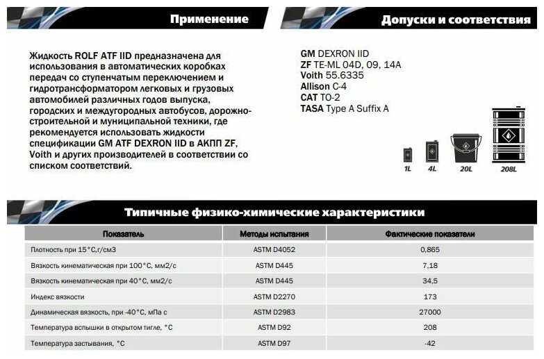 Type: gearbox, automatic transmission, Transmission oils, composition: mineral, API standard: ROLF ATF II 4l plastic, SAE viscosity: Not subject to SAE classification, gearbox type: automatic
