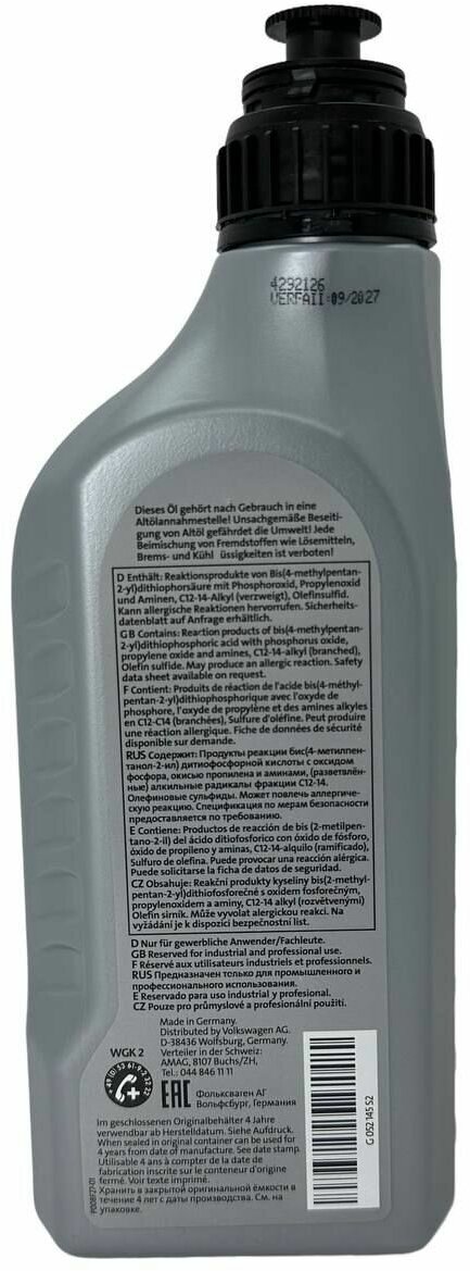 Type: gearbox, composition: synthetic, API standard: GL-5, SAE viscosity: 75W-90, gearbox type: automatic, manual, robotic