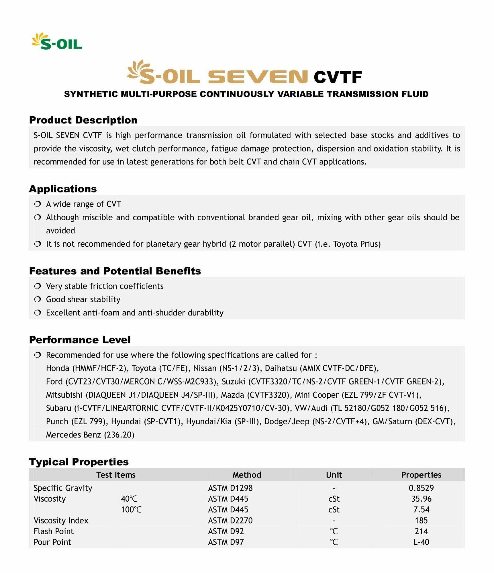 Daihatsu Amix CVTF-DC, Daihatsu Amix CVTF-DFE, Dodge NS-2, Ford CVT23, Ford CVT30, GM DEX-CVT, Honda HCF-2, Honda HMMF, Jeep CVTF+4, Jeep NS-2, MB 236.20, Mazda CVTF 3320, Mercon C, Mitsubishi SP-III, Nissan NS-1, Nissan NS-2, Nissan NS-3, Saturn DEX-CVT,