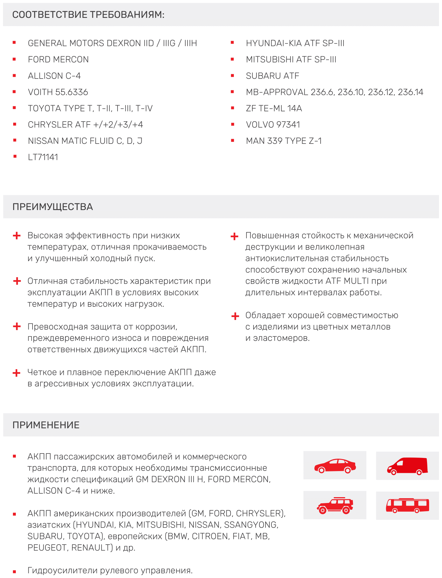 Allison C4, Chrysler ATF +, Chrysler ATF +2, Chrysler ATF +3, Chrysler ATF +4, ESSO LT71141, Ford MERCON SP, Ford Mercon C, Ford Mercon LV, Ford Mercon ULV, Ford Mercon V, GM Dexron II D, GM Dexron III G, GM Dexron III H, Hyundai SP III, Kia SP III, MAN 3