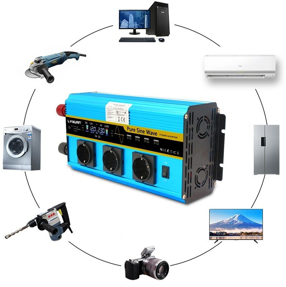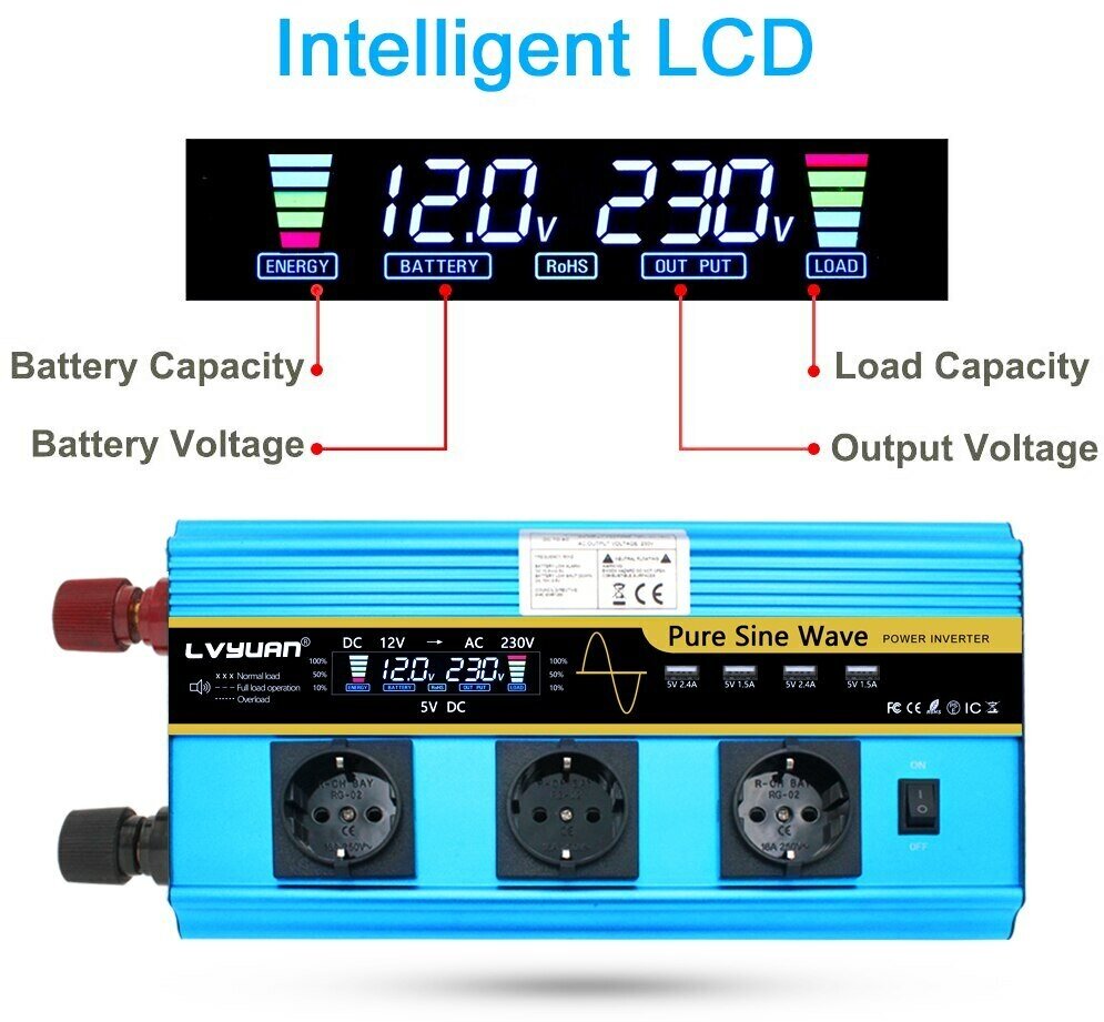 Voltage converter, 2500 W, signal shape: sine wave, 4 USB, connection to battery: terminals, input. voltage: 12 V, output. voltage: 220 V, built-in display, overheat protection, overload protection, power protection