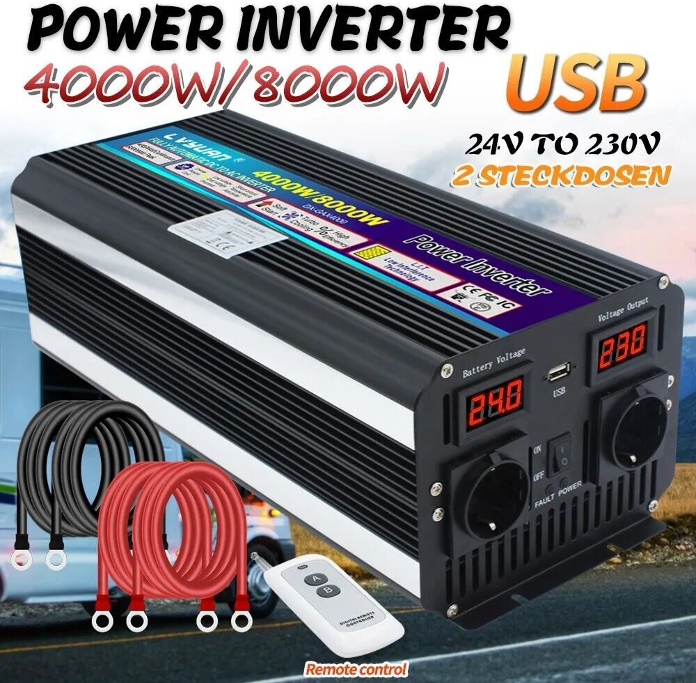 Voltage converter, signal shape: approximated sinusoid, 1 USB, input. voltage: 12 V, output. voltage: 220V, built-in display, overheat protection, overload protection, overvoltage protection