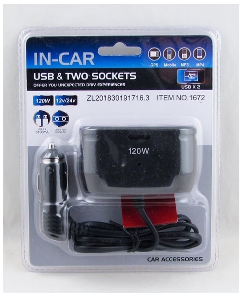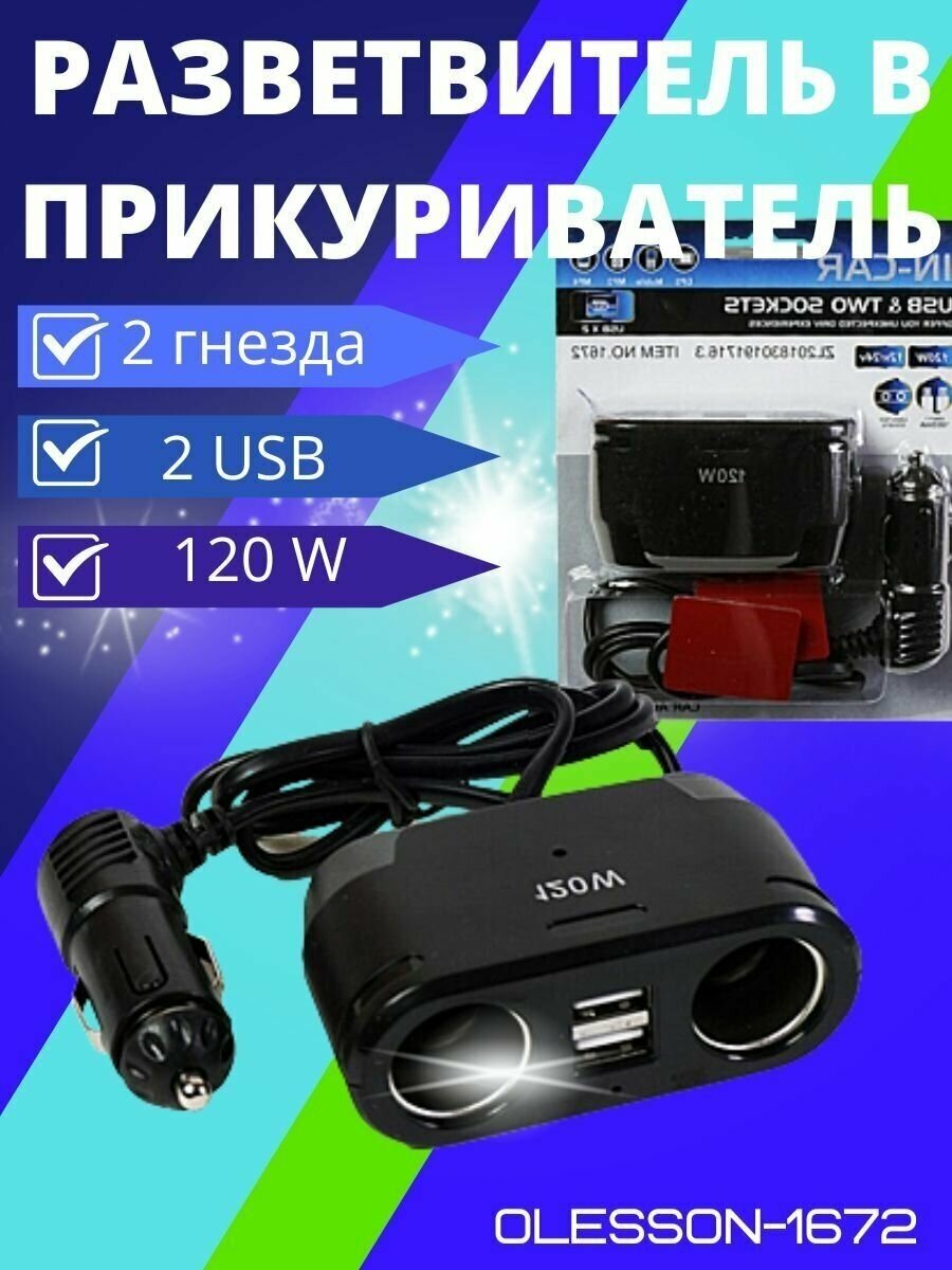 Body: solid, number of slots: 2, presence of USB, number of USB ports: 2, features: use of a cigarette lighter, wire length: 10 cm, input voltage: 12 V, 24 V, total output current: 2.10 A, maximum total current p