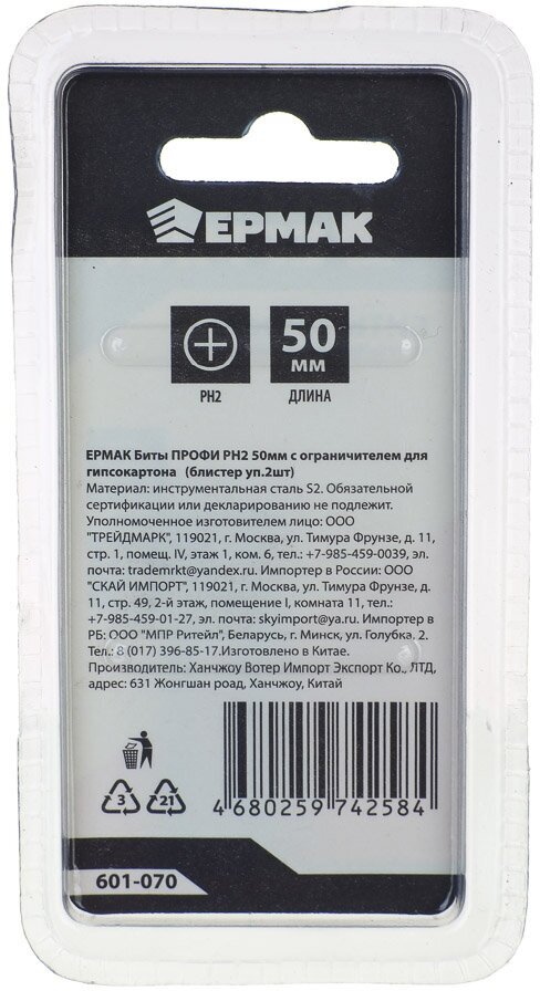 Bits PH2 50mm with limiter for plasterboard, 2 pieces, Ermak pro