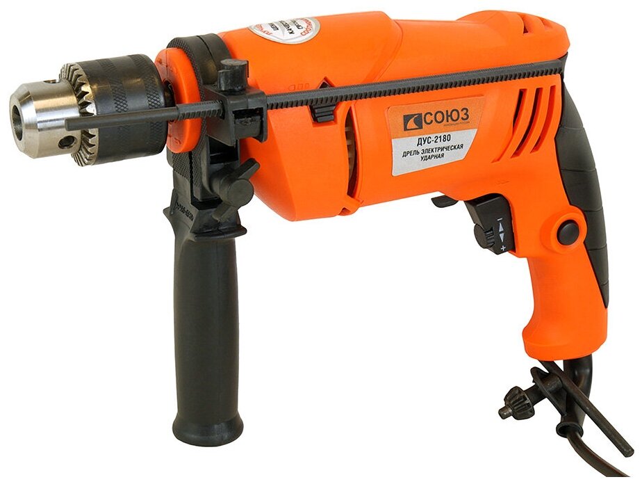 Power button lock, additional handle, drilling depth limiter, Depth limiter, Adjustable limiter, Rubber-coated handles, Motor brake