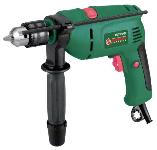 Type: drill, power type: from the mains, presence of a blow for the drill: impact, chuck type: key, functions: work in the rack of a drilling machine, reverse, rotation speed adjustment, power consumption: 960 W, features cons
