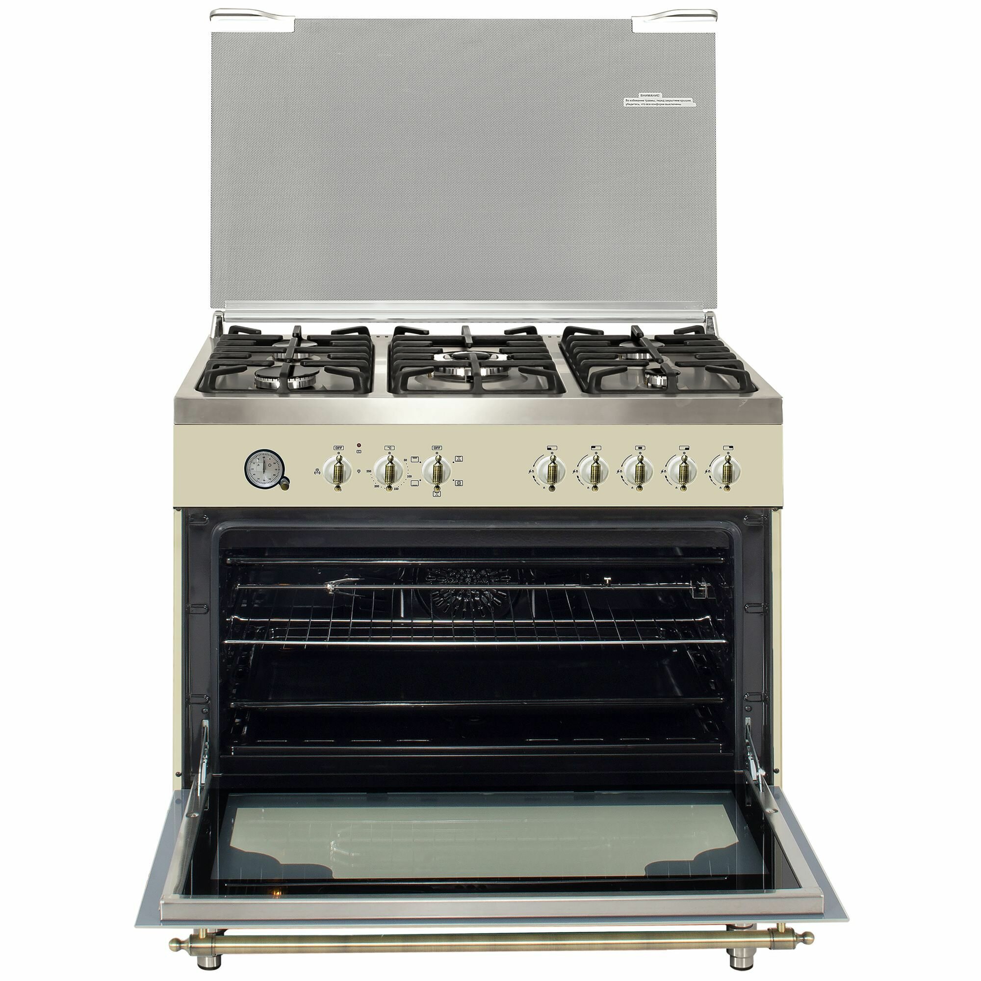 Spit, oven light, cast iron grates, utensil drawer, analog clock with timer, ring heating element in the oven