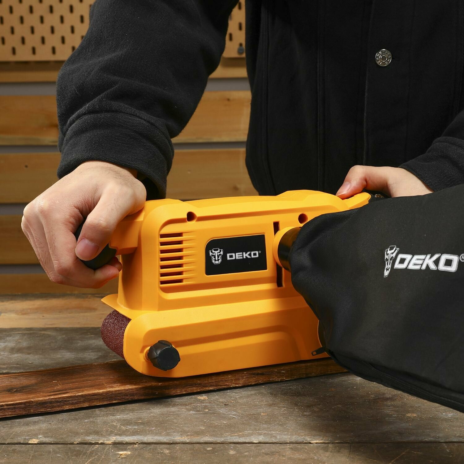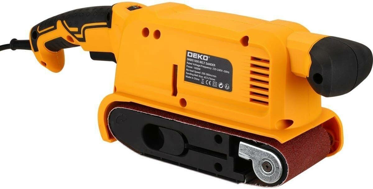 Power type: mains, power consumption: 1000 W, max. belt speed: 380 m/min, belt width: 76 mm, belt length: 457 mm, functions: speed control, design features: dust collector, dust removal, connection