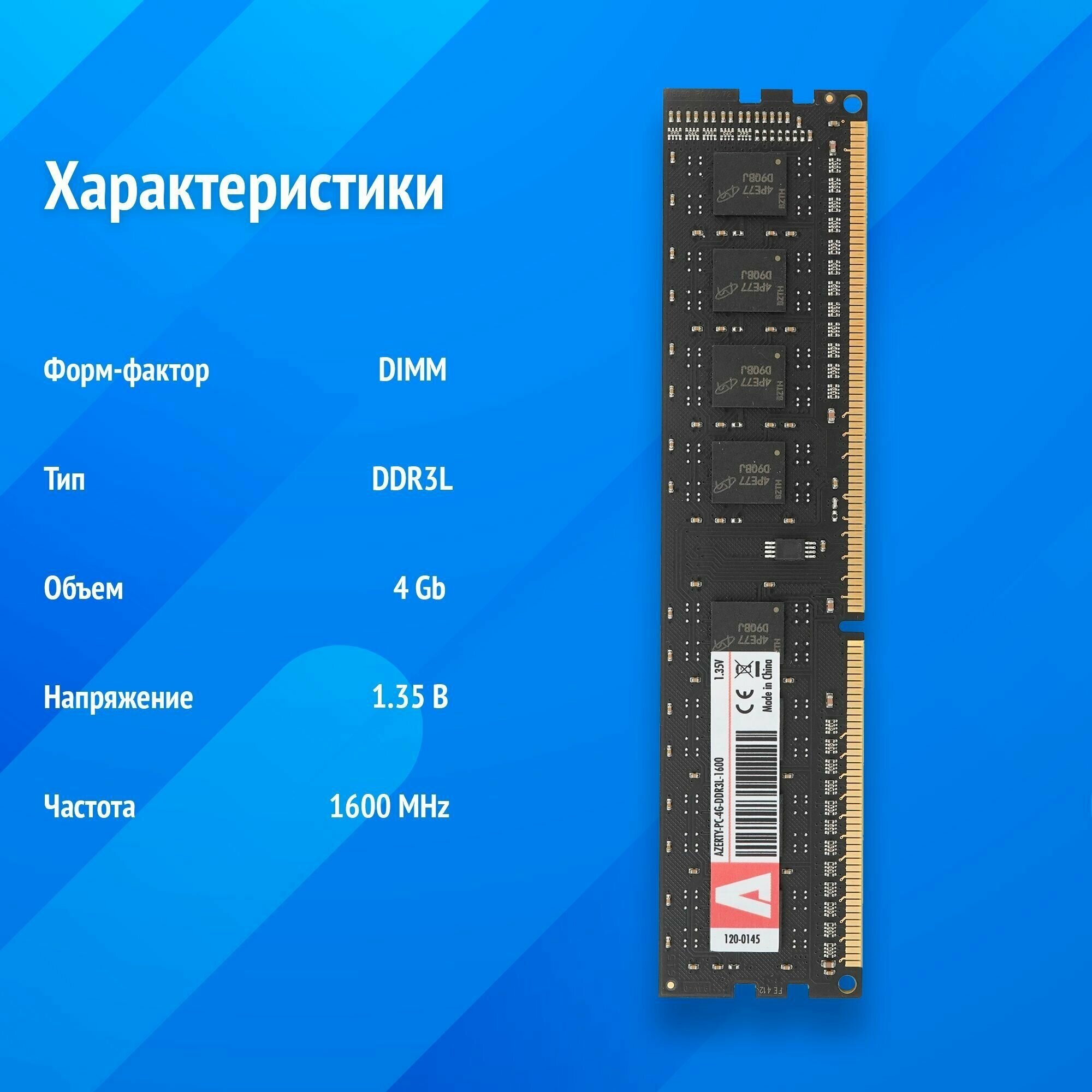 Type: DDR3L, capacity of one module: 4 GB, clock frequency: 1600 MHz, form factor: DIMM, number of modules included: 1 pc.