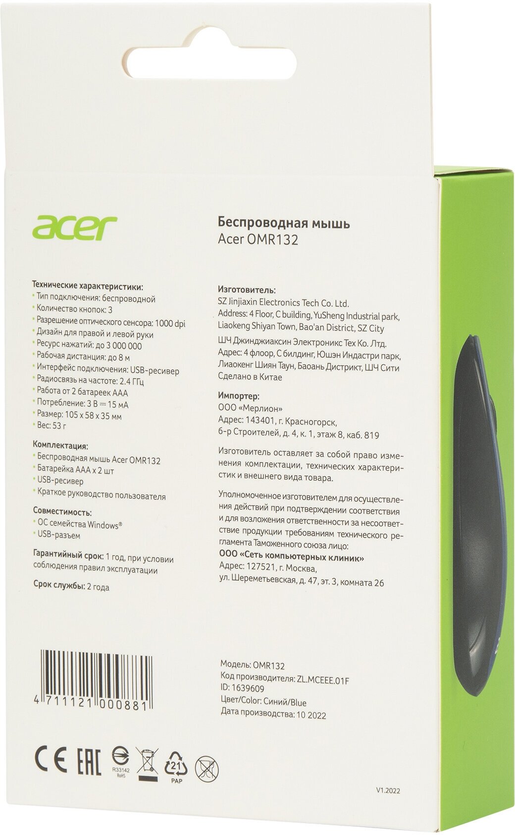 Acer OMR132 blue/black optical 1000dpi wireless USB for laptop 2but