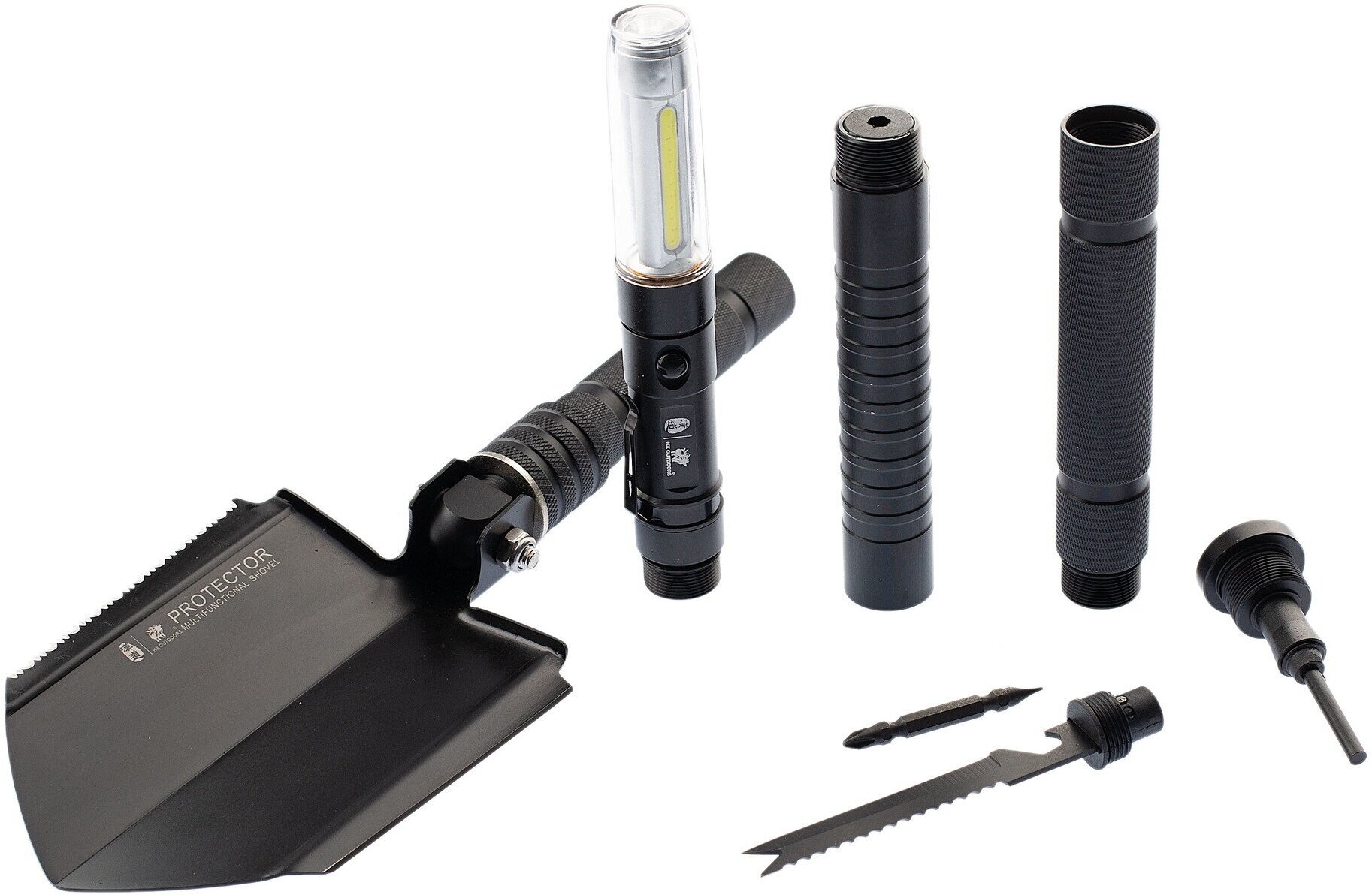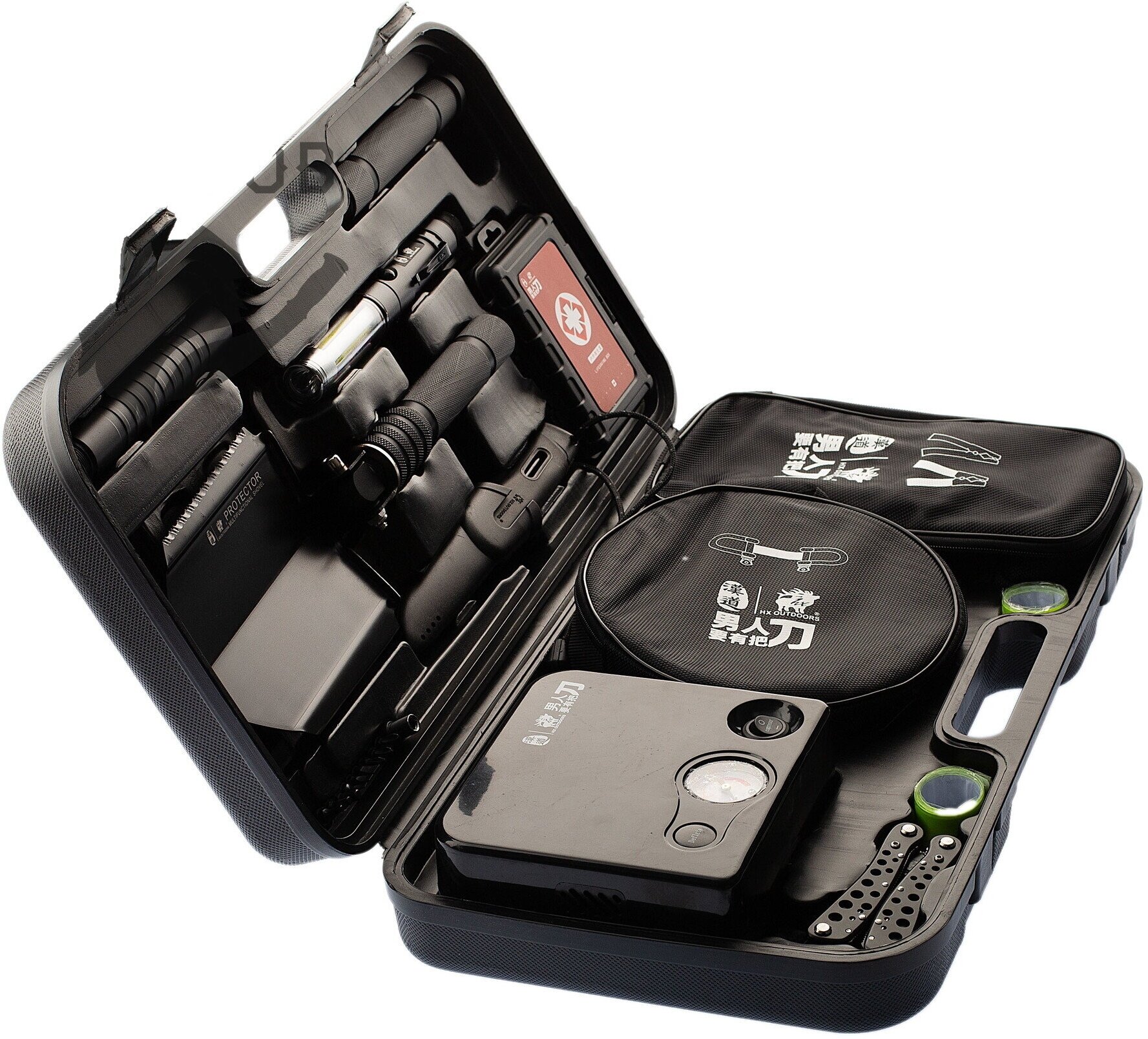 1. Multifunctional shovel; 2. Set of screwdrivers; 3. Multifunctional survival knife; 4. First aid kit; 5. Flashlight; 6. Pliers; 7.Tow rope; 8. Electric pump; 9. Starting wires; 10. C