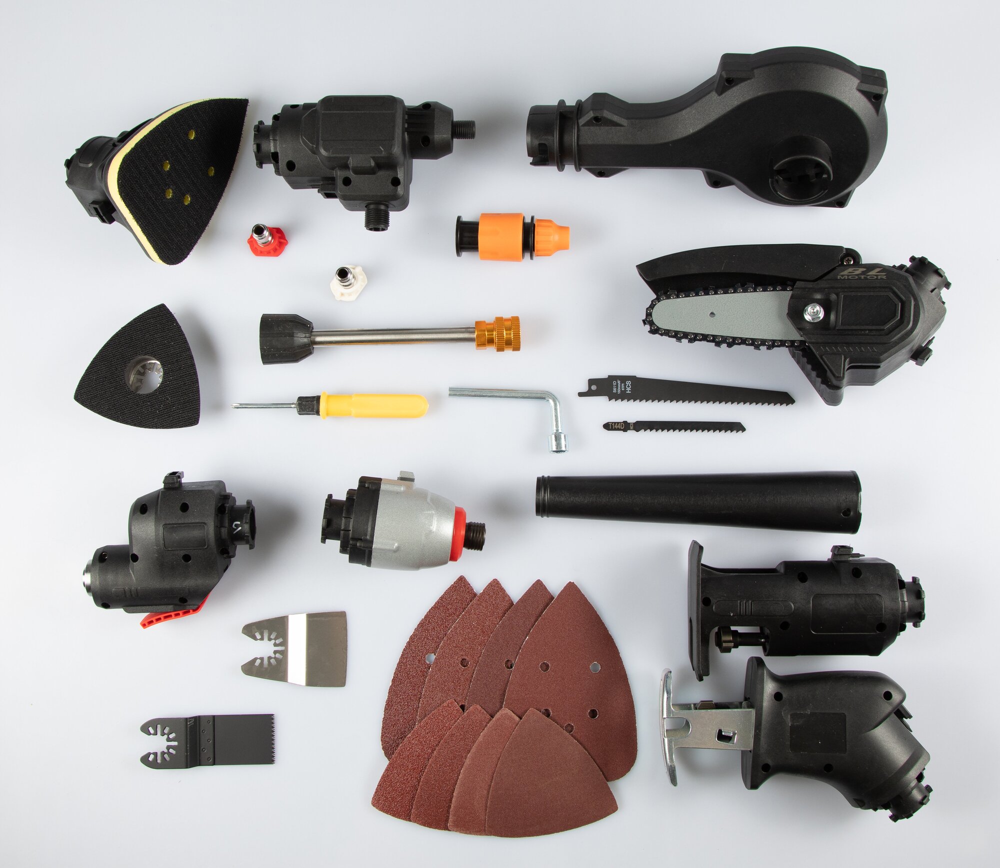 1. cordless drill screwdriver attachment 2. cordless impact impact attachment 3. cordless blower attachment 4. cordless renovator attachment 5. cordless reciprocating saw attachment 6. portable attachment