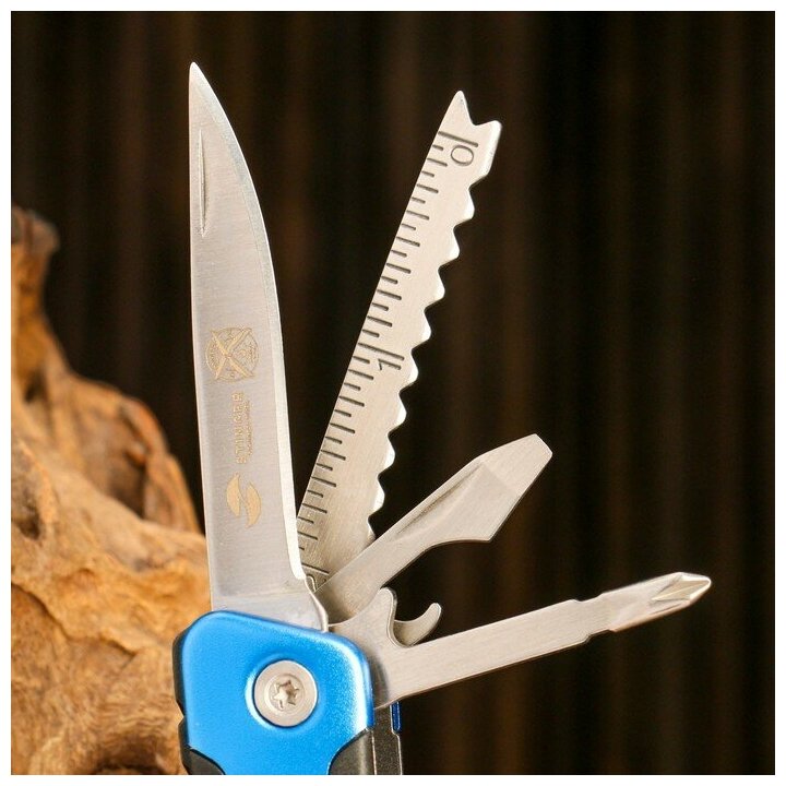 Can opener, ruler, file, knife, screwdriver, bottle opener, tongs
