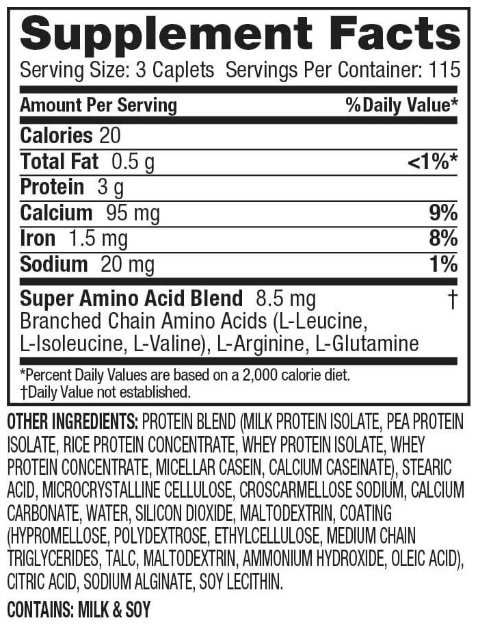 Type: amino acid complex, dosage form: capsules/tablets, main ingredient: arginine, valine, glutamine, isoleucine, leucine, dietary features: aspartame free, gluten free, sucralose free
