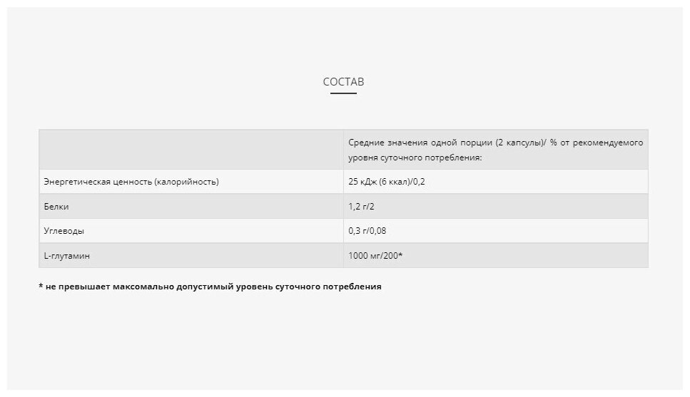 Type: amino acid, dosage form: capsules/tablets, main ingredient: glutamine, dietary features: aspartame free, gluten free, lactose free, sucralose free