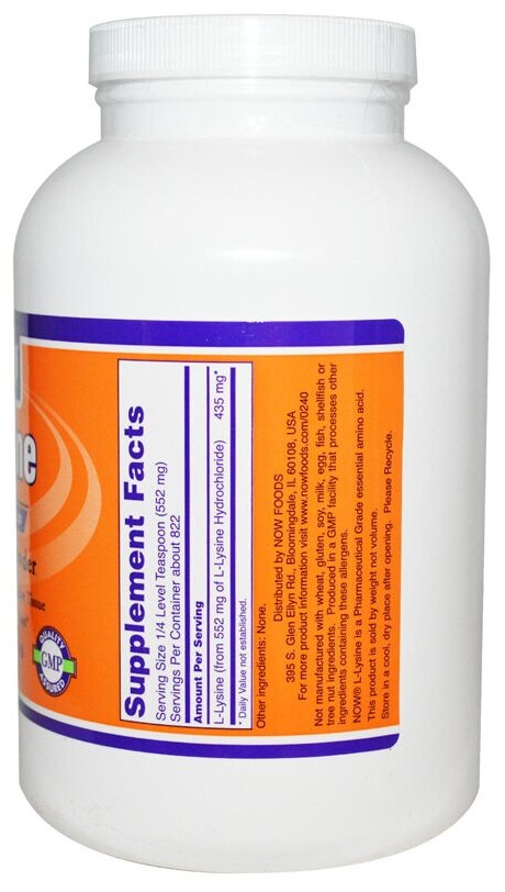 Type: amino acid, dosage form: powder, main ingredient: lysine, dietary specifics: no aspartame, no gluten, no maltodextrin, no sucralose