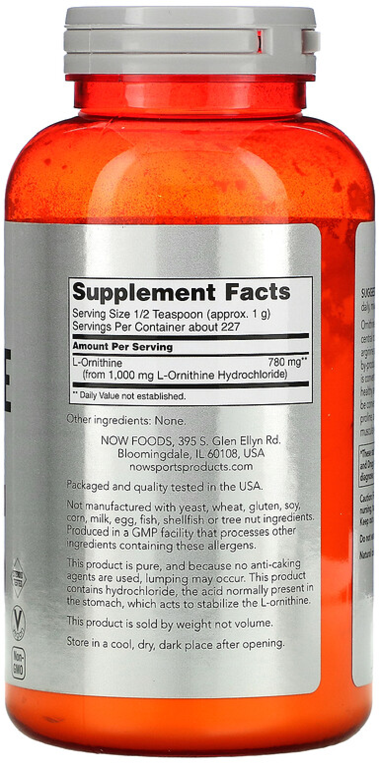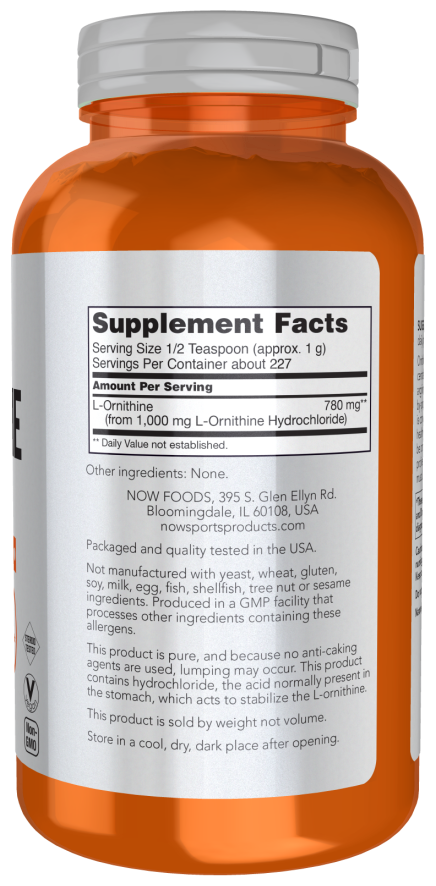 Type: amino acid, dosage form: powder, main ingredient: ornithine, dietary specifics: aspartame free, gluten free, maltodextrin free, sucralose free