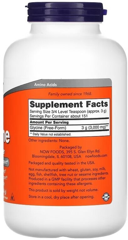 Type: amino acid, dosage form: powder, main ingredient: glycine, dietary features: aspartame free, gluten free, maltodextrin free, sucralose free