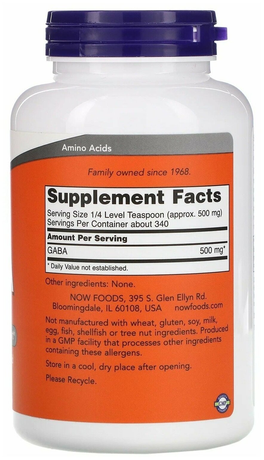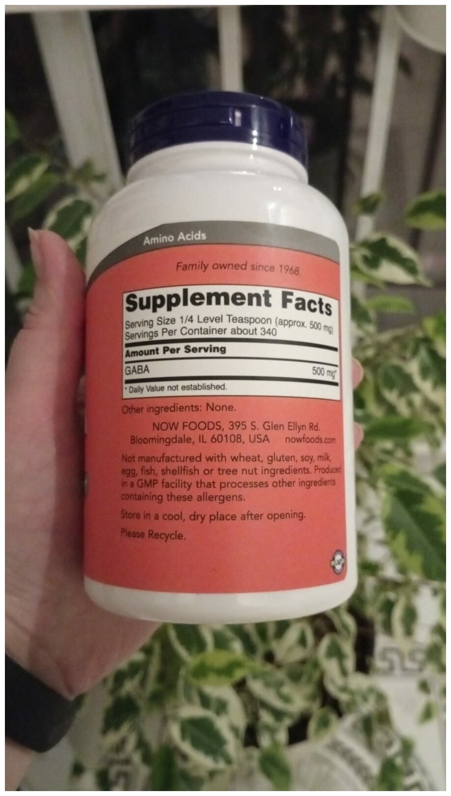 Type: amino acid, dosage form: powder, main ingredient: GABA, dietary features: no aspartame, no gluten, no maltodextrin, no sucralose