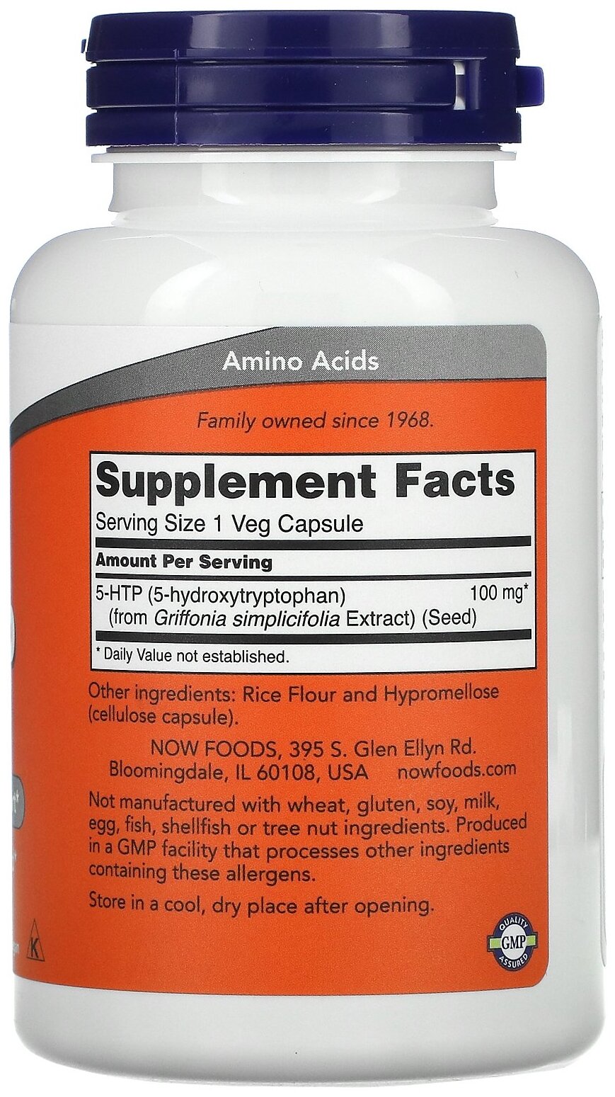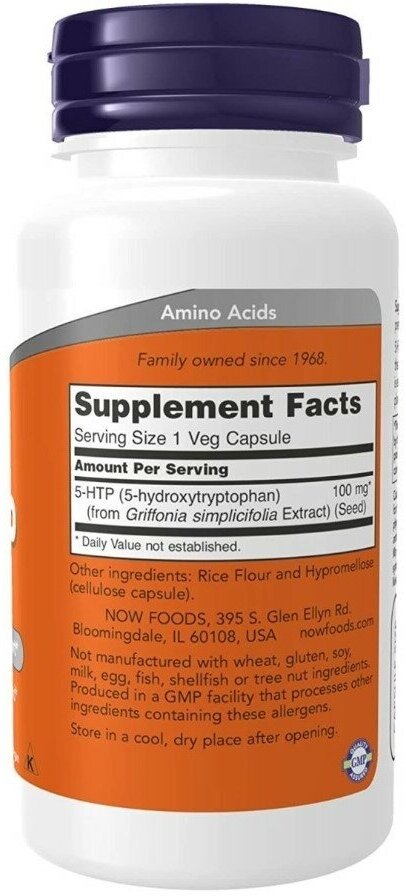 Nutrition Facts Serving Size: 1 Vegetarian Capsule Amount Per Serving % Daily Value 5-Hydroxytryptophan from Griffonia simplicifolia Seed Extract 100 mg * * Daily Value has not been determined.