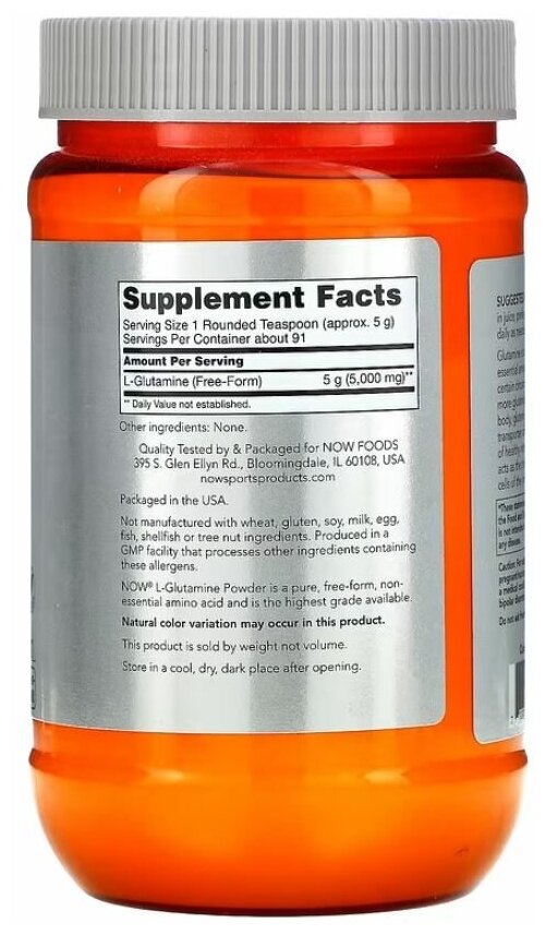 Type: amino acid, dosage form: powder, main ingredient: glutamine, dietary features: no aspartame, no gluten, no maltodextrin, no sucralose