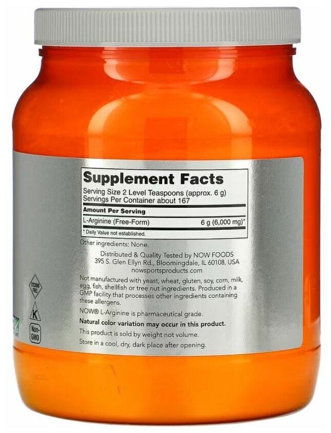 Type: amino acid, dosage form: powder, main ingredient: arginine, dietary specifics: no aspartame, no gluten, no maltodextrin, no sucralose