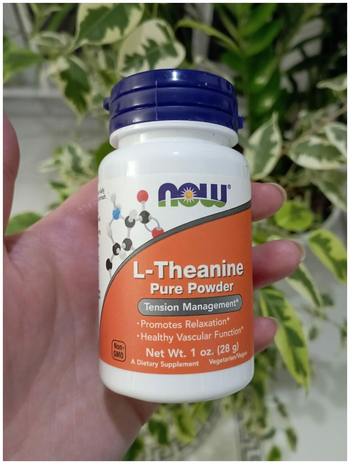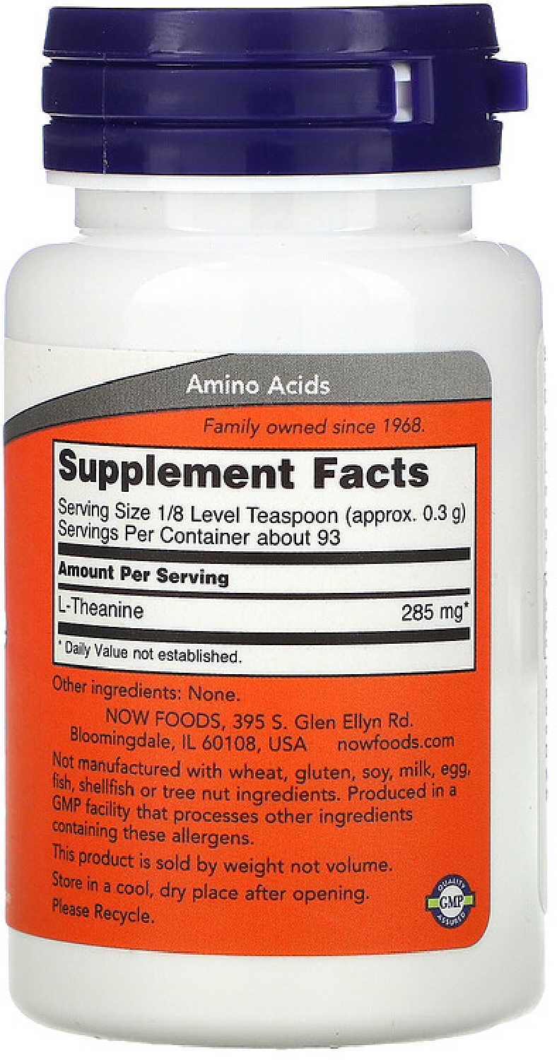 Type: amino acid, dosage form: powder, main ingredient: L-theanine, dietary features: aspartame free, gluten free, maltodextrin free, sucralose free, vegetarian