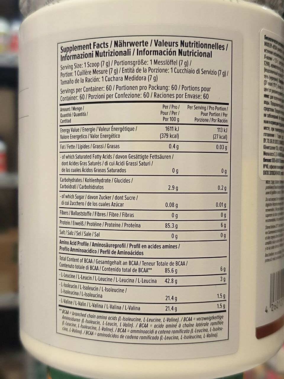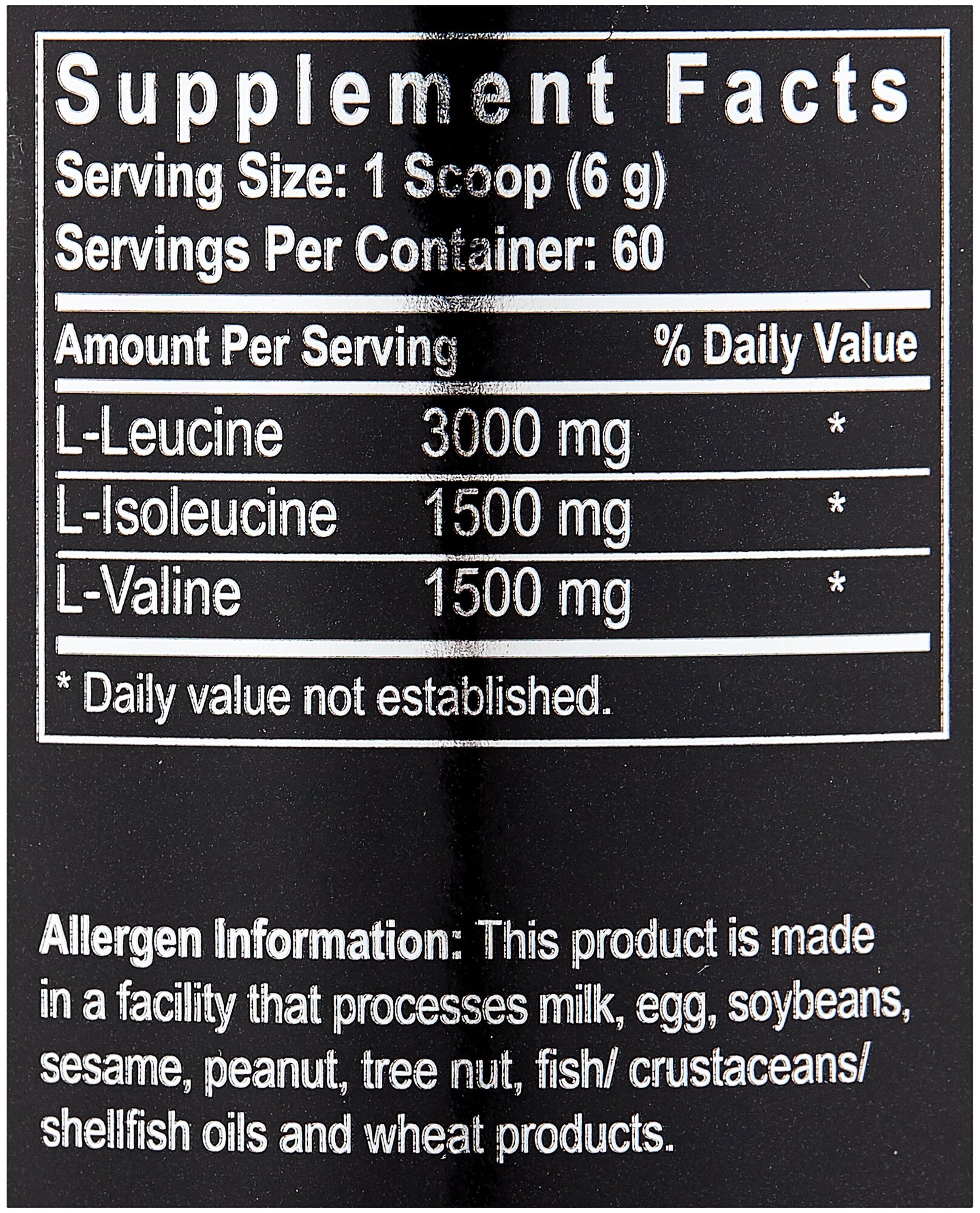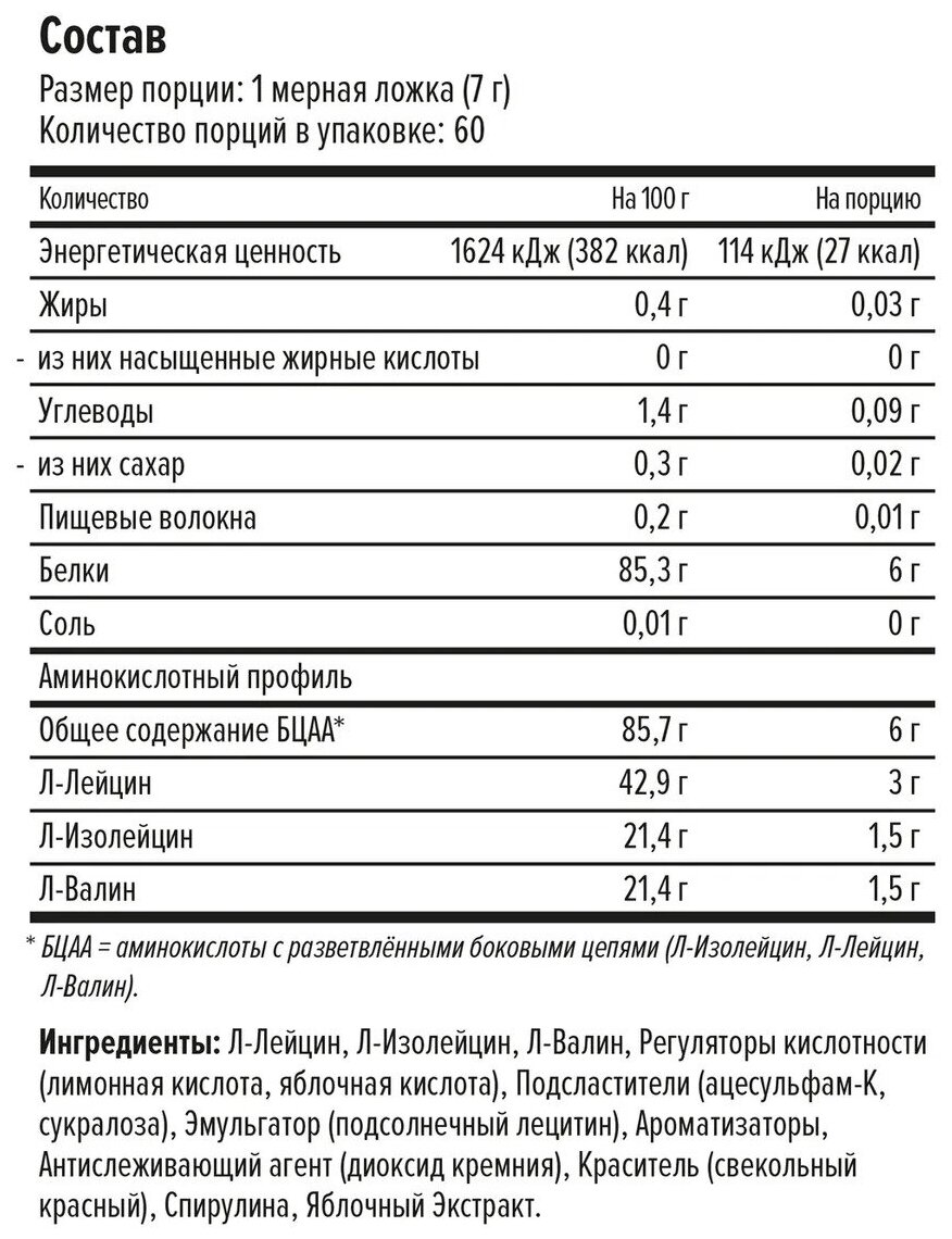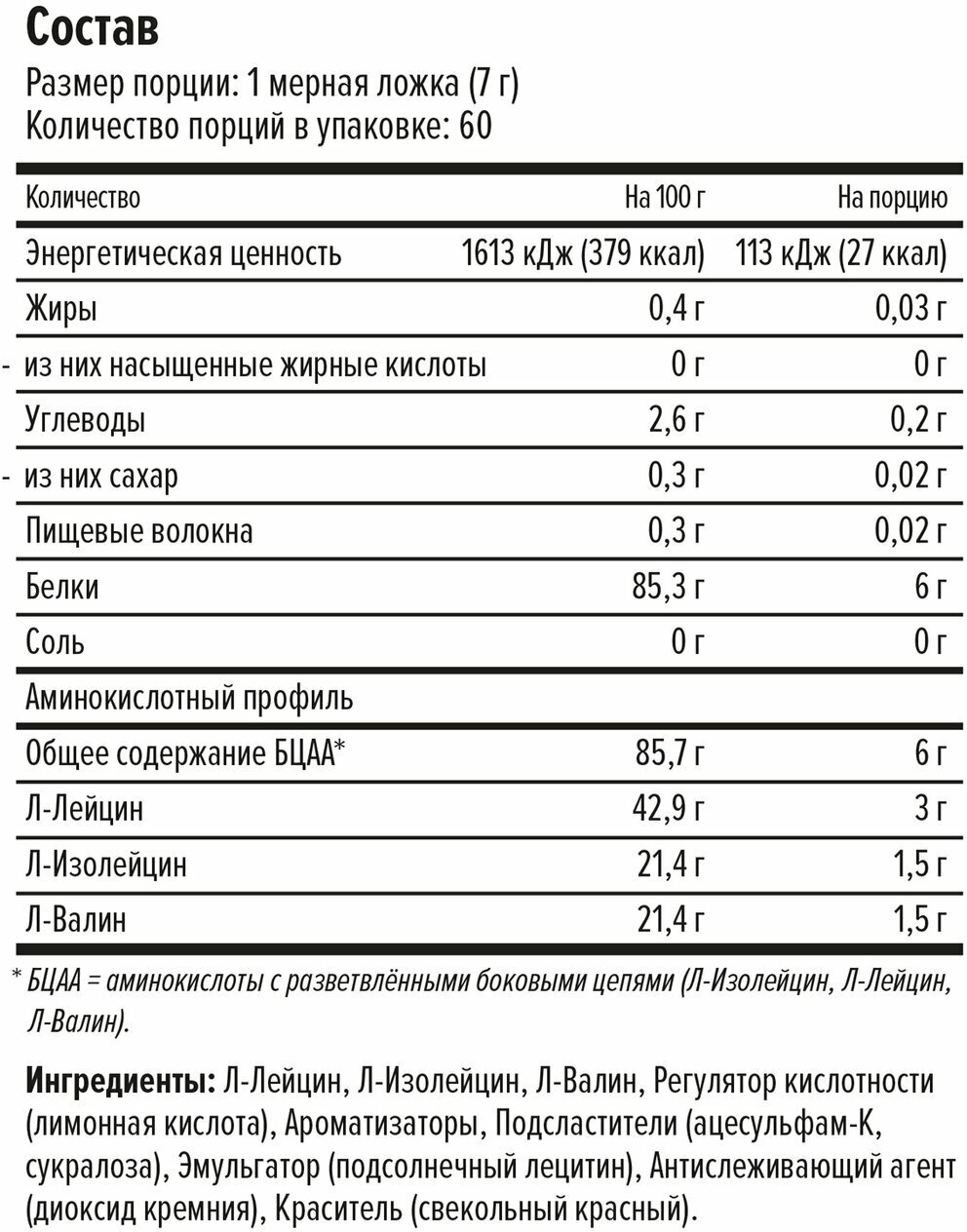 Type: BCAA, amino acid complex, formulation: powder, main ingredient: valine, isoleucine, leucine