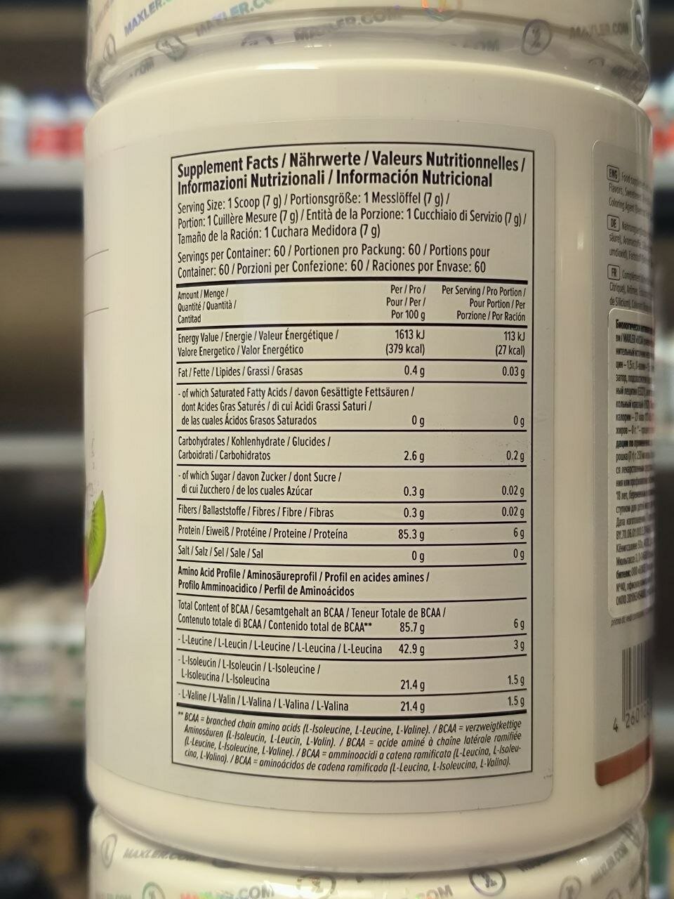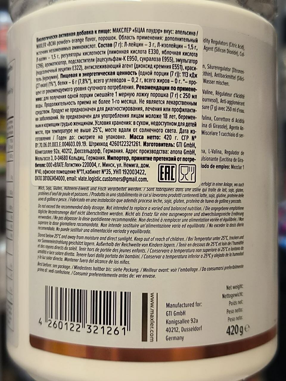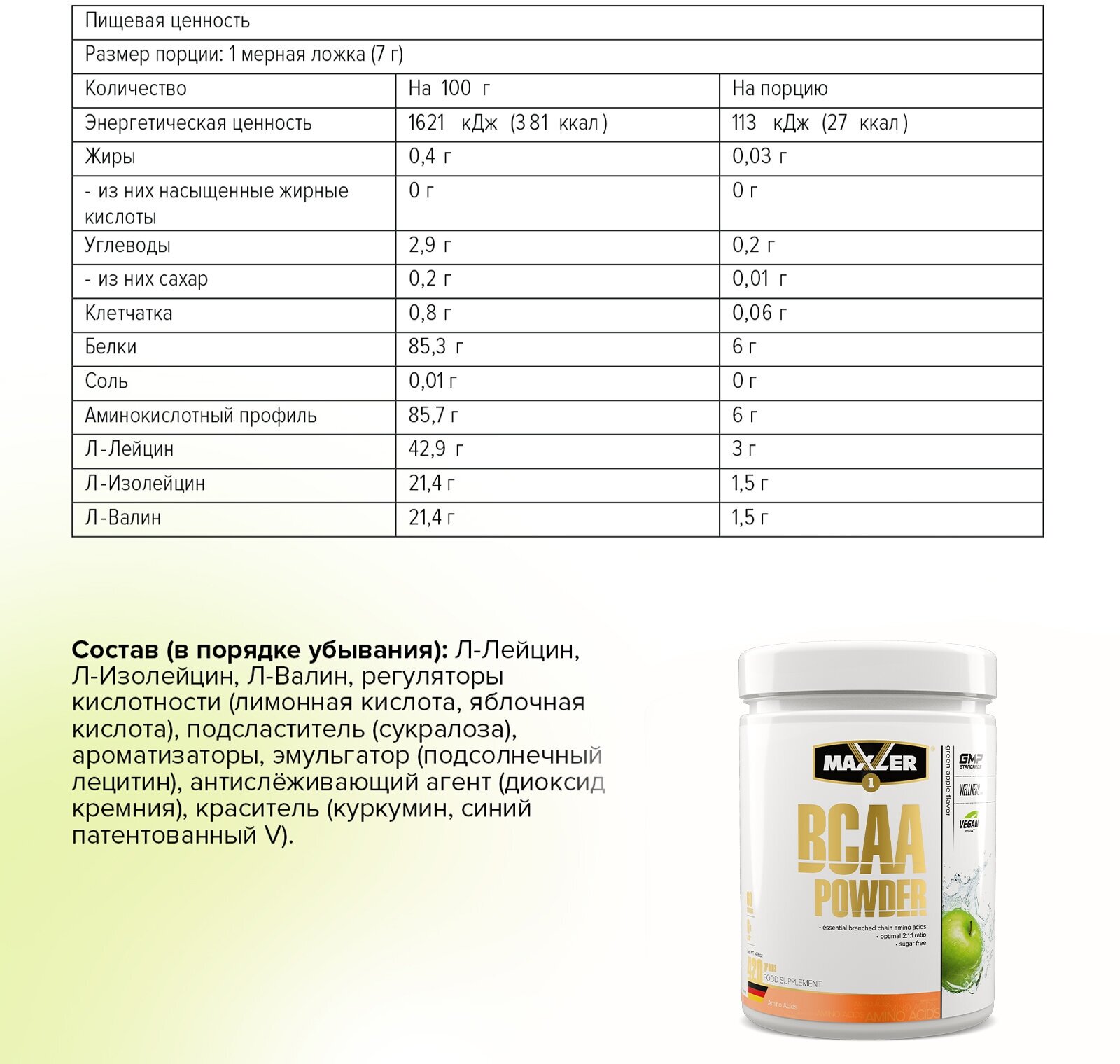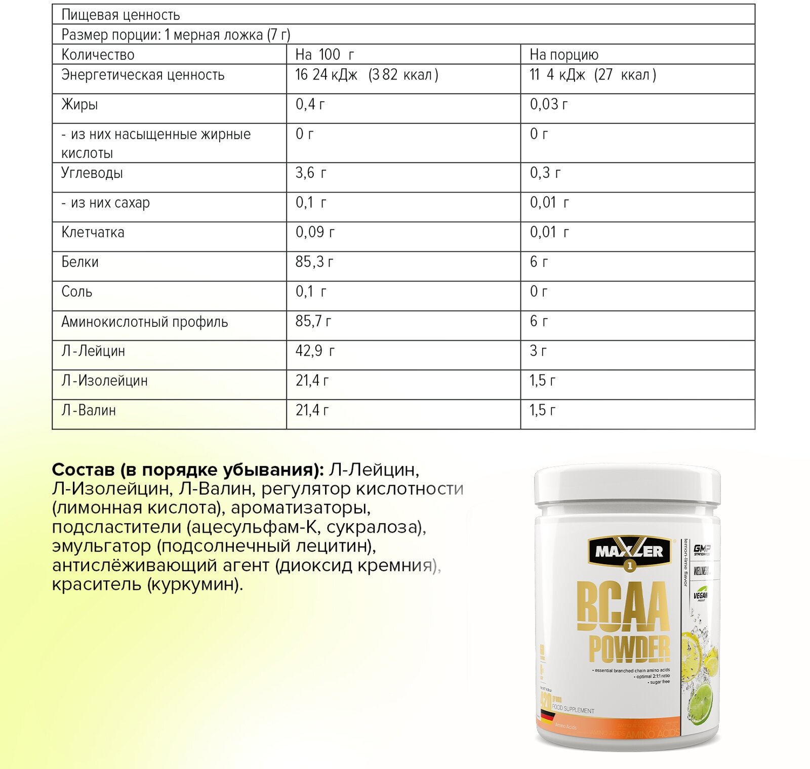 Type: BCAA, amino acid complex, formulation: powder, main ingredient: valine, isoleucine, leucine