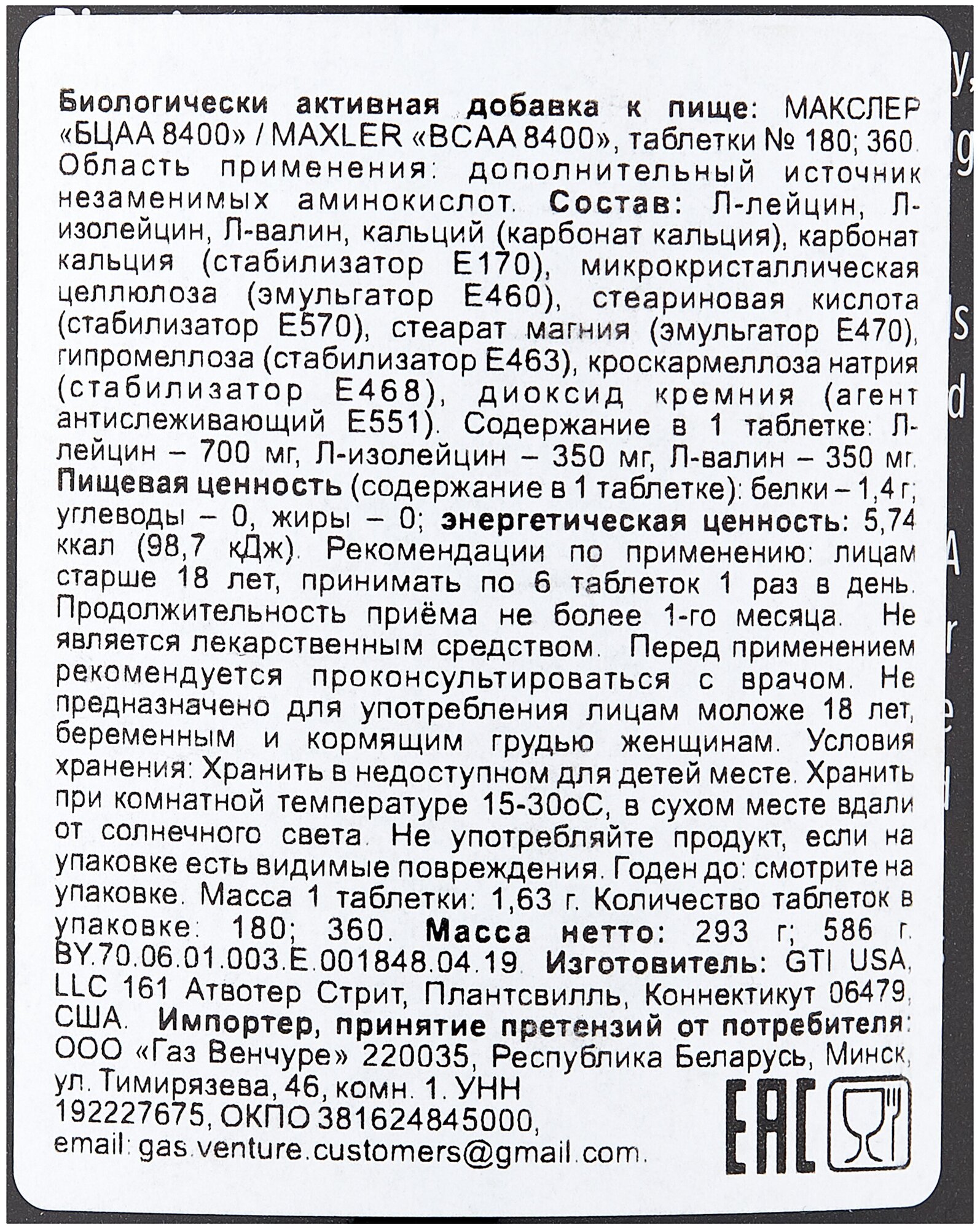 Amino acids Maxler BCAA 8400 2:1:1, 180 tablets | Sports nutrition BCAA | For men and women, weight loss and muscle gain