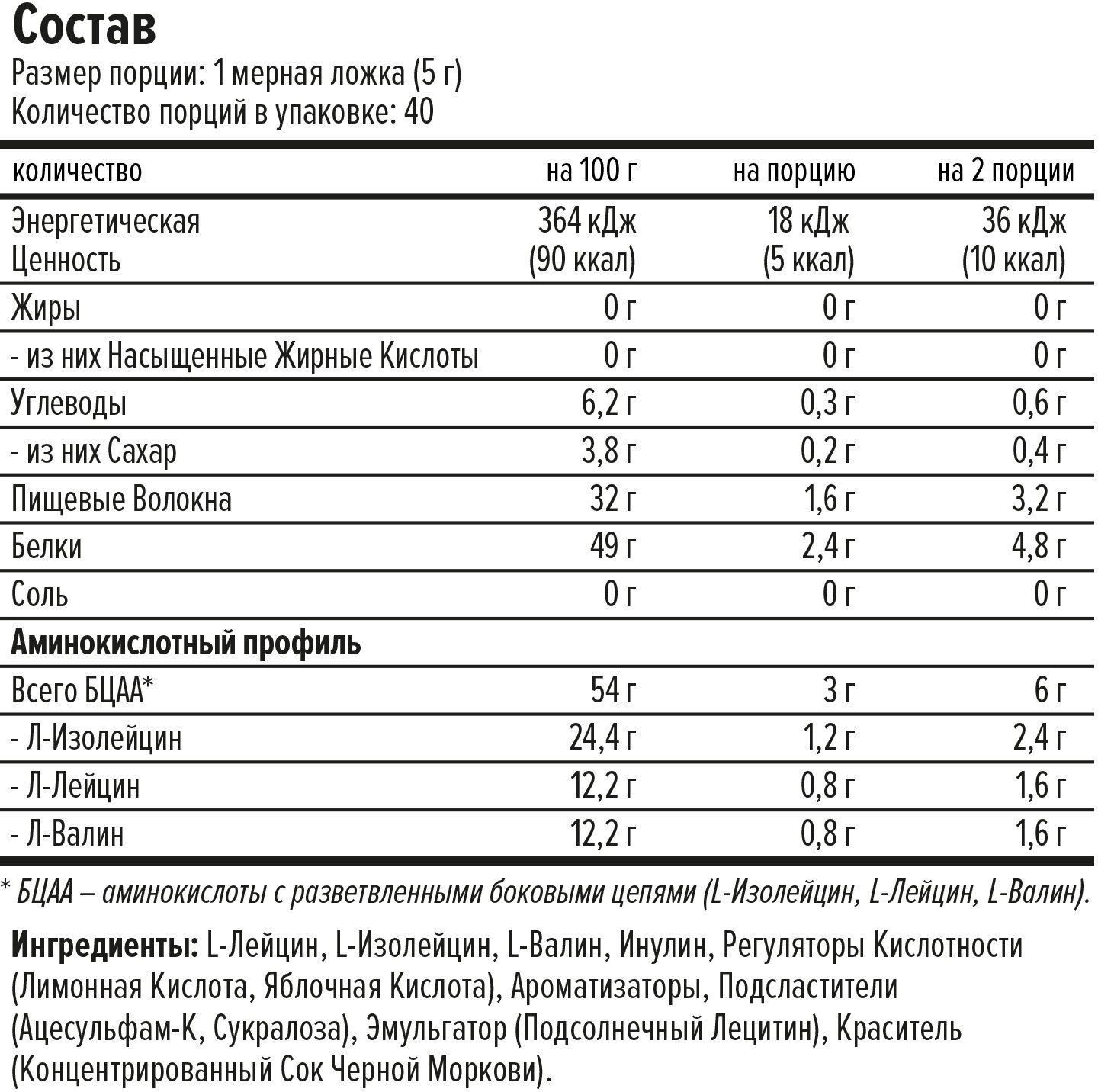 Type: BCAA, formulation: powder, main ingredient: valine, isoleucine, leucine, dietary specifics: vegan