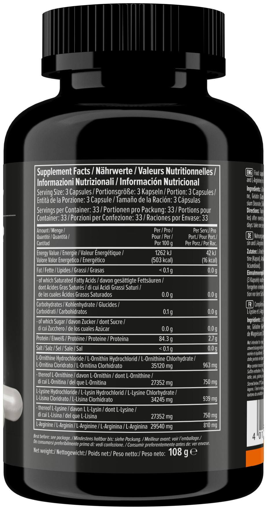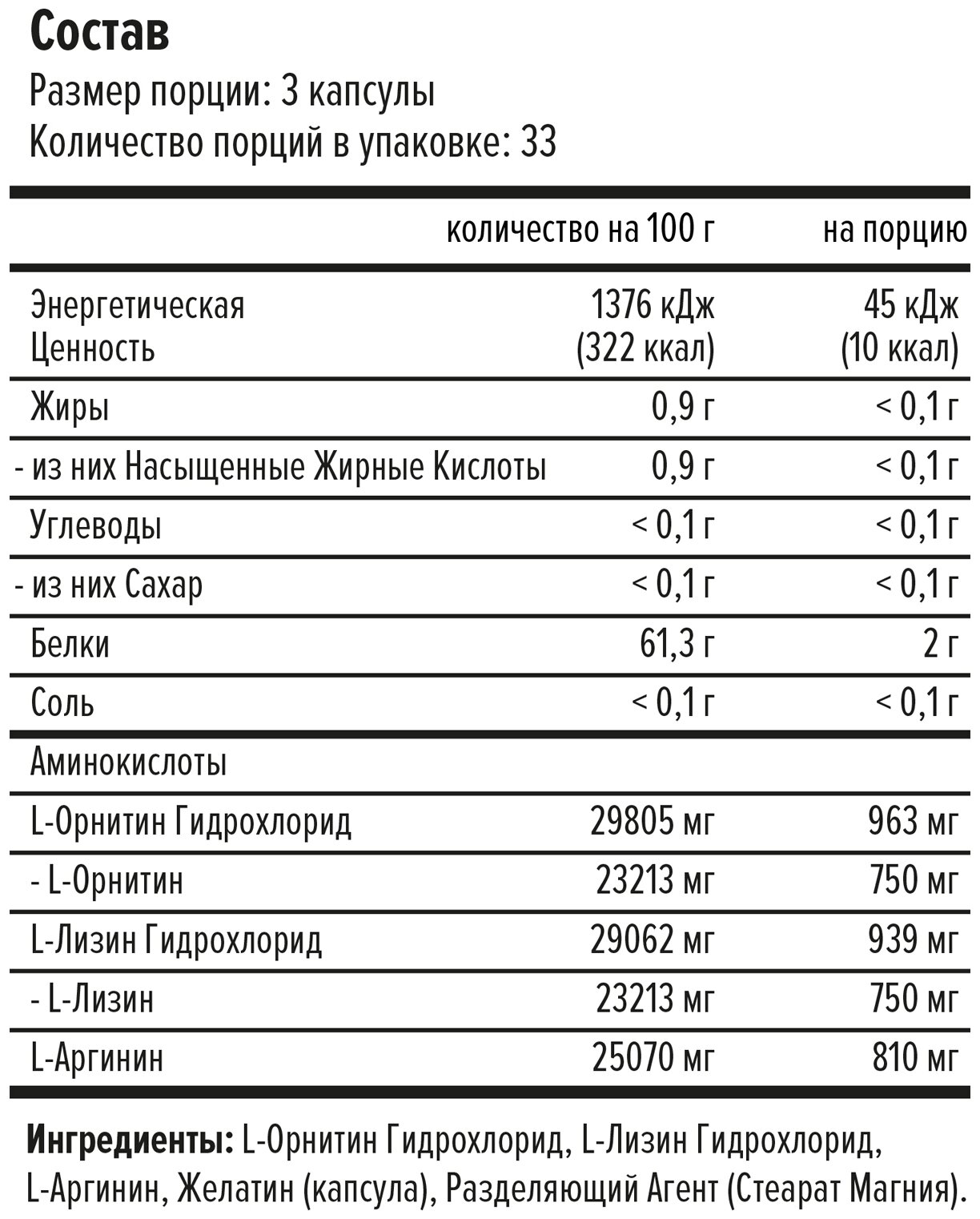 Type: amino acid, amino acid complex, formulation: capsules/tablets, main ingredient: arginine, lysine, ornithine