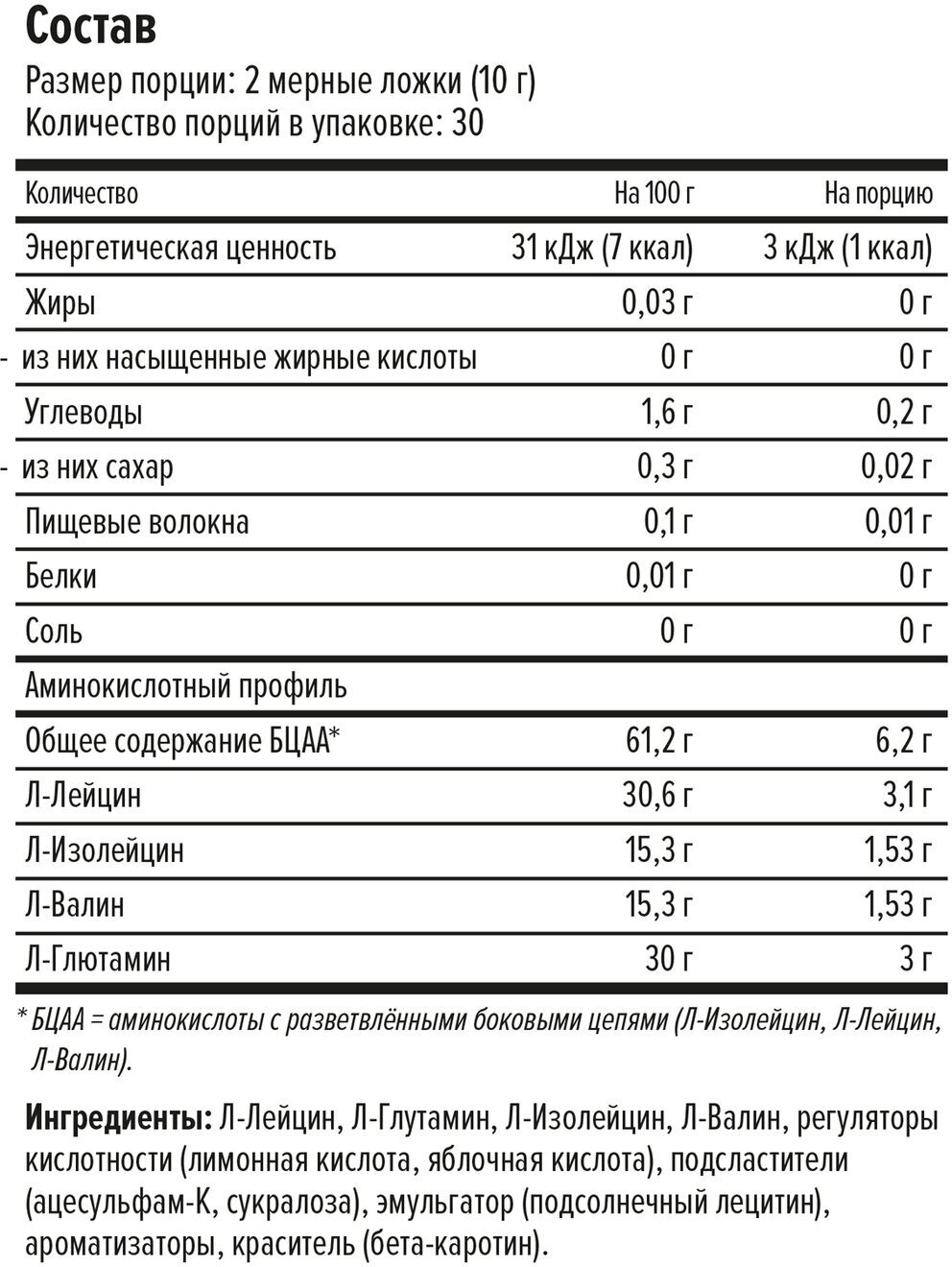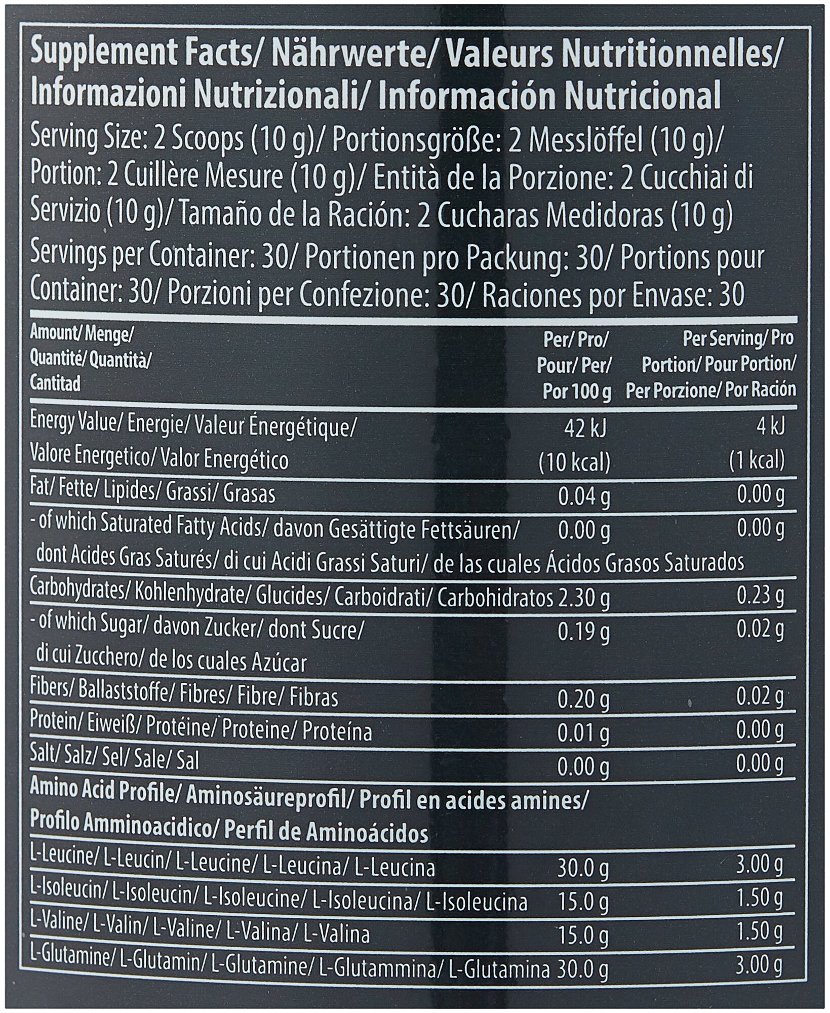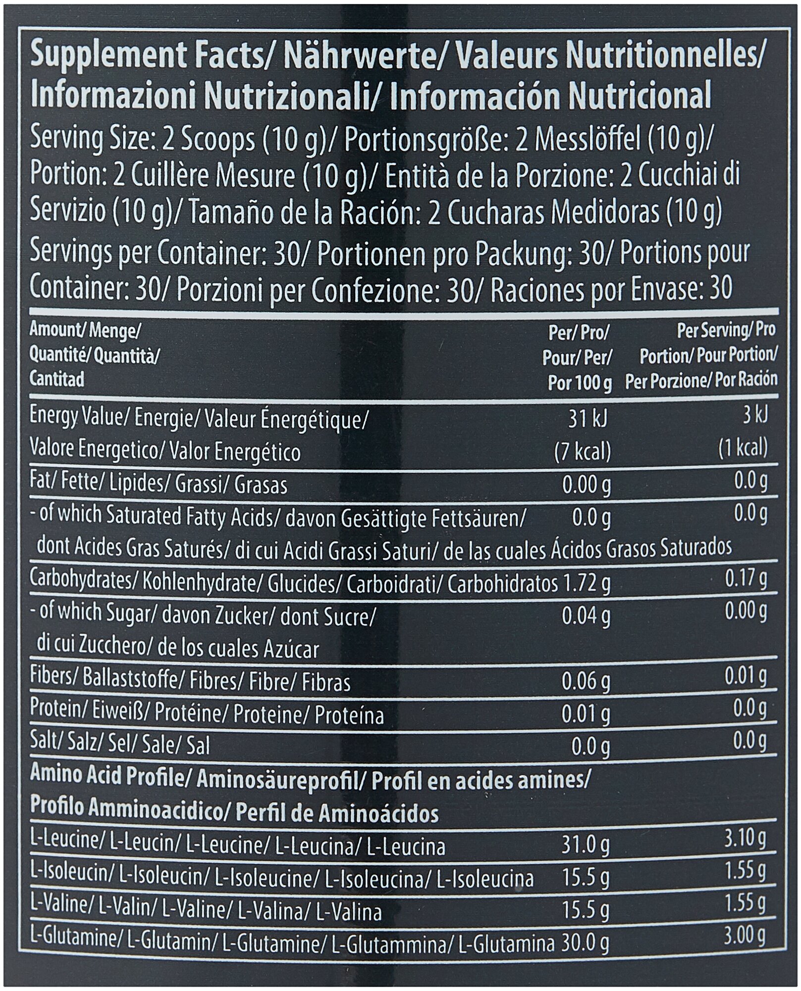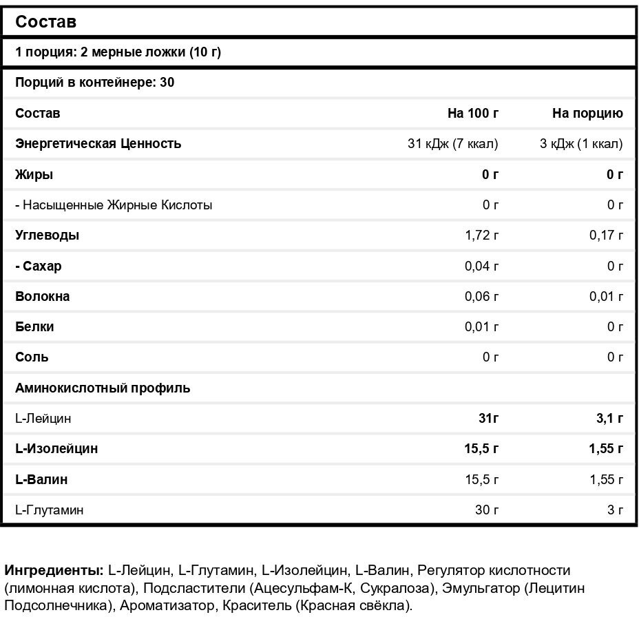 Additional Information: Energy value of one portion of 10 g: 3 kJ / 1 kcal, carbohydrates - 0.02 g, L-leucine - 3.1 g, L-valine - 1.53 g, L-isoleucine - 1.53 g, L-Glutamine - 3 g; serving size in gml: 10; purpose: to build muscle mass, enhances the synthesis of protein