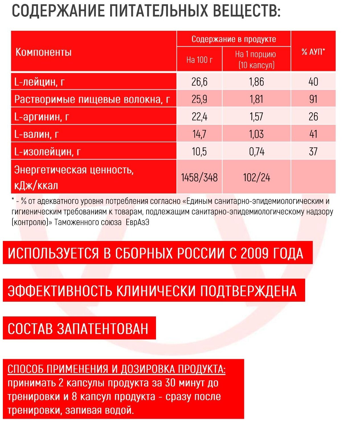 Type: BCAA, amino acid complex, formulation: capsules/tablets, main ingredient: arginine, valine, isoleucine, leucine
