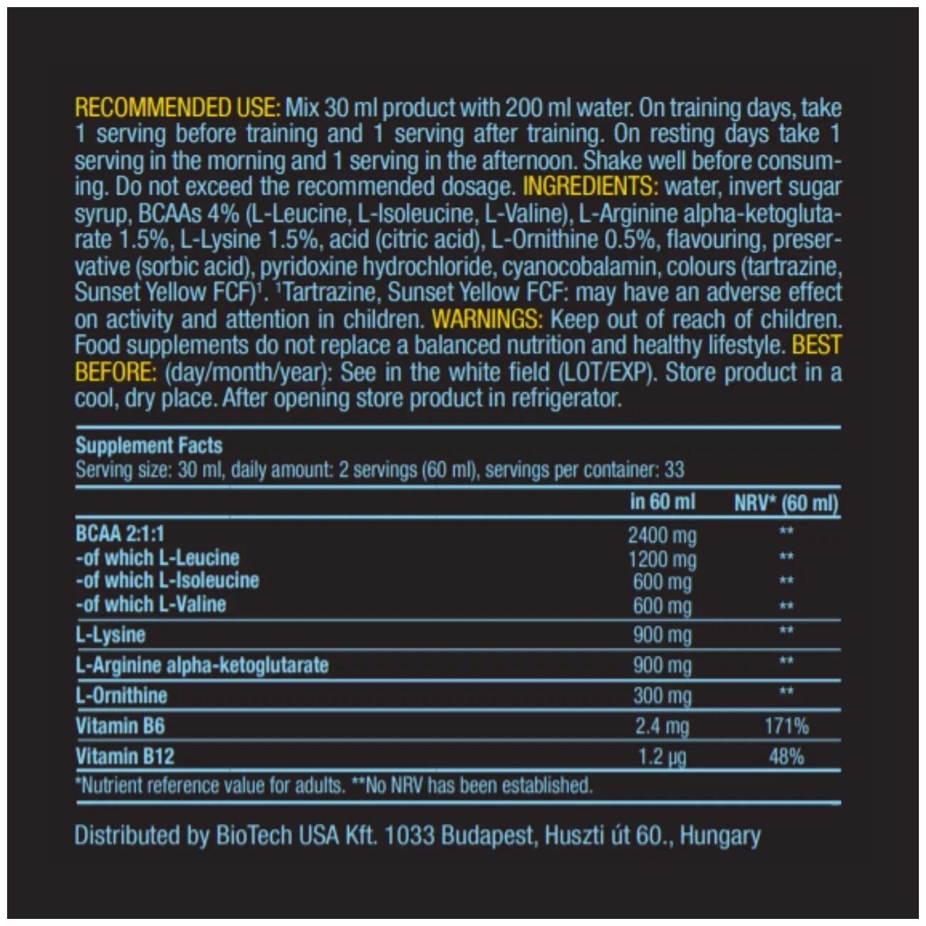 Type: BCAA, amino acid complex, formulation: solution, main ingredient: valine, isoleucine, leucine, lysine, ornithine