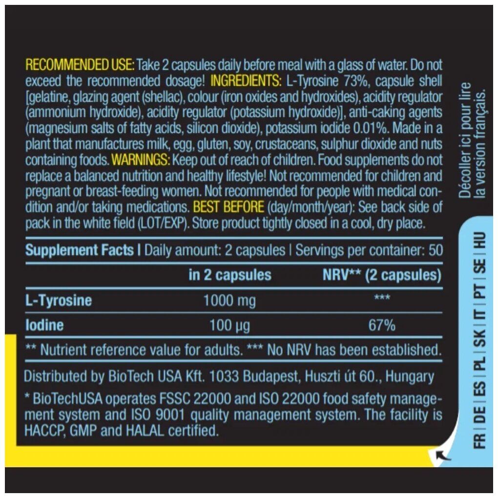 Type: amino acid, dosage form: capsules/tablets, main ingredient: tyrosine, dietary features: aspartame free, gluten free, maltodextrin free, sucralose free