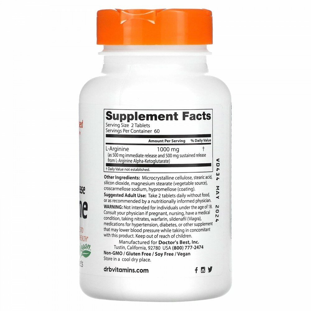 Type: amino acid, dosage form: capsules/tablets, main ingredient: arginine, dietary features: aspartame free, gluten free, maltodextrin free, sucralose free, vegetarian