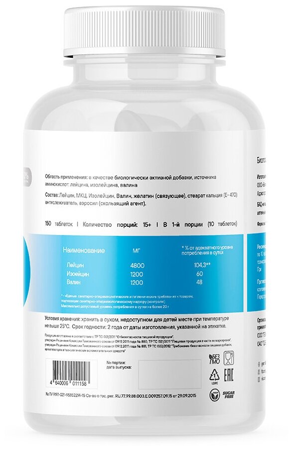 Type: BCAA, Form: Capsule/Tablet, Main Ingredient: Valine, Isoleucine, Leucine, Dietary: Aspartame Free, Gluten Free, Lactose Free, Maltodextrin Free, Sucralose Free