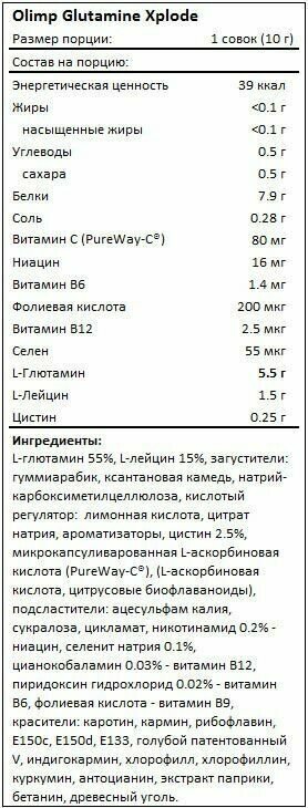 Type: amino acid, amino acid complex, formulation: powder, main ingredient: glutamine, leucine, cysteine, dietary features: no aspartame, no gluten, no maltodextrin