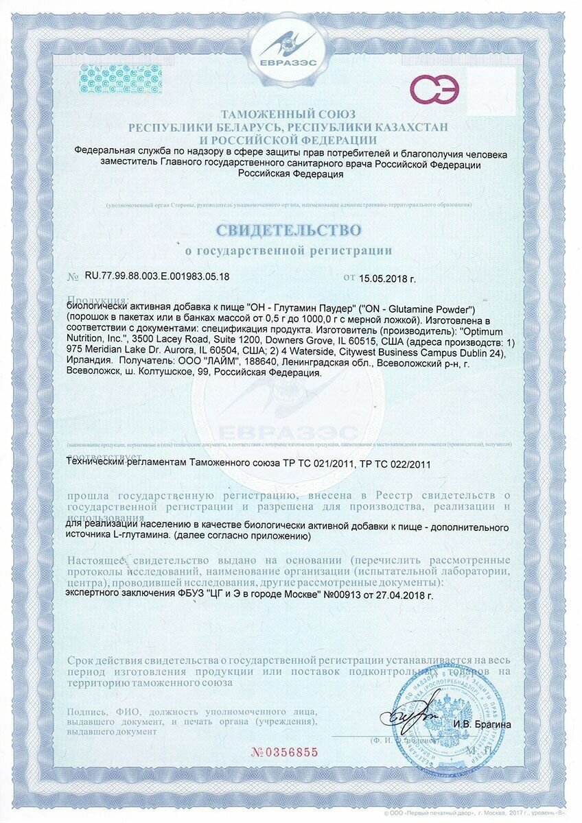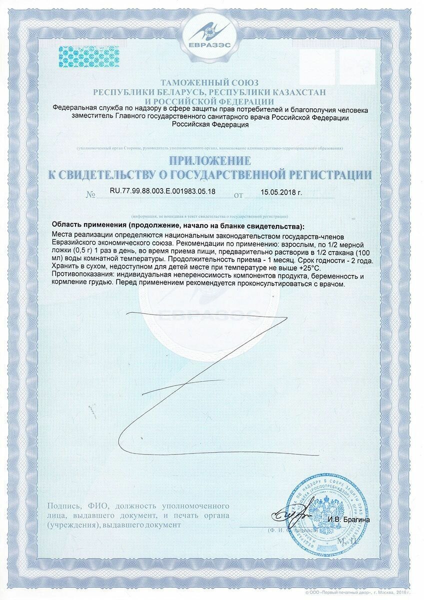 Registered as dietary supplement: Yes, document of conformity RU.77.99.88.003.Е.001983.05.18 dated 15.05.2018