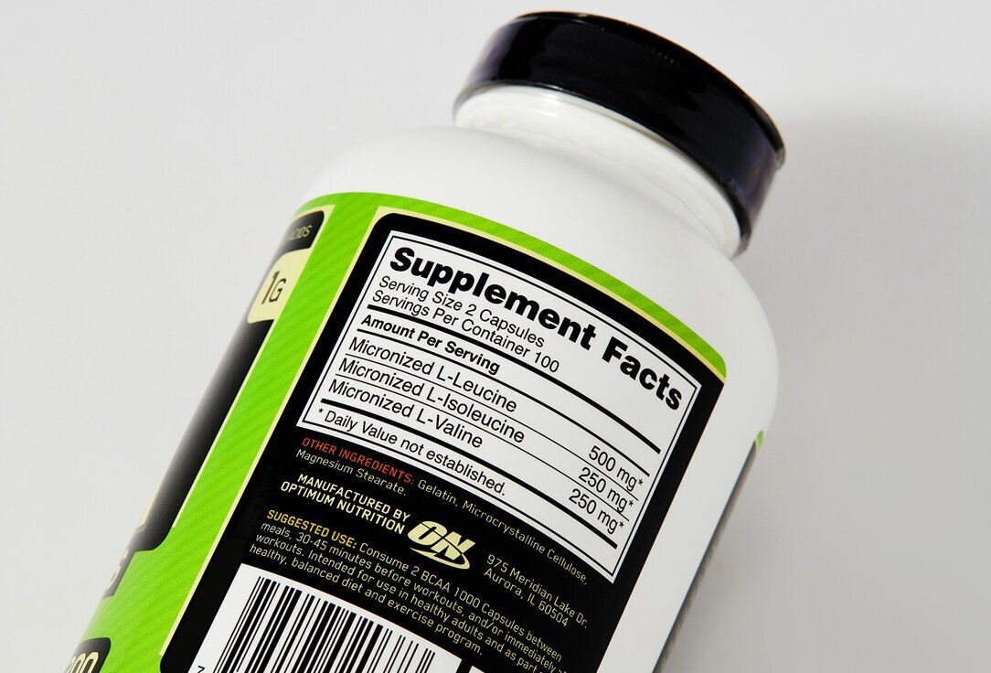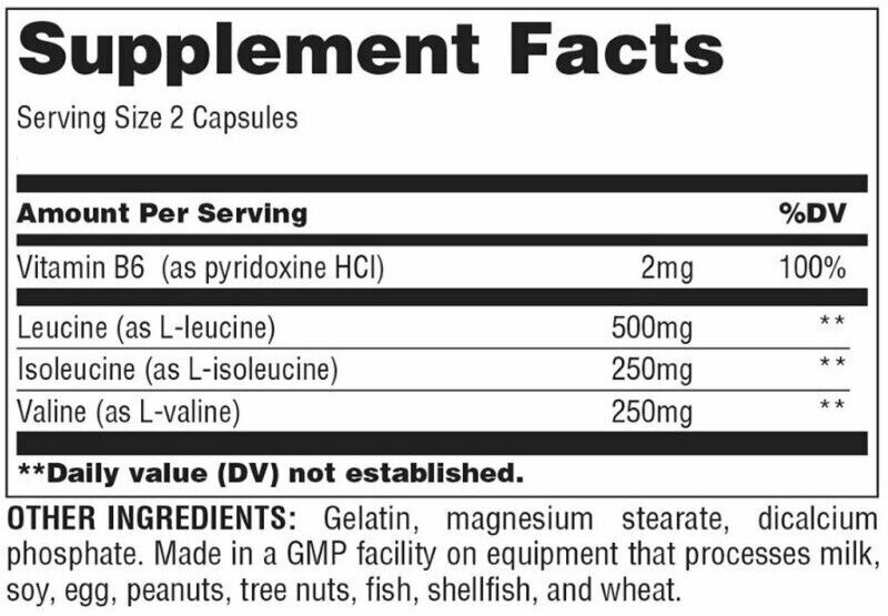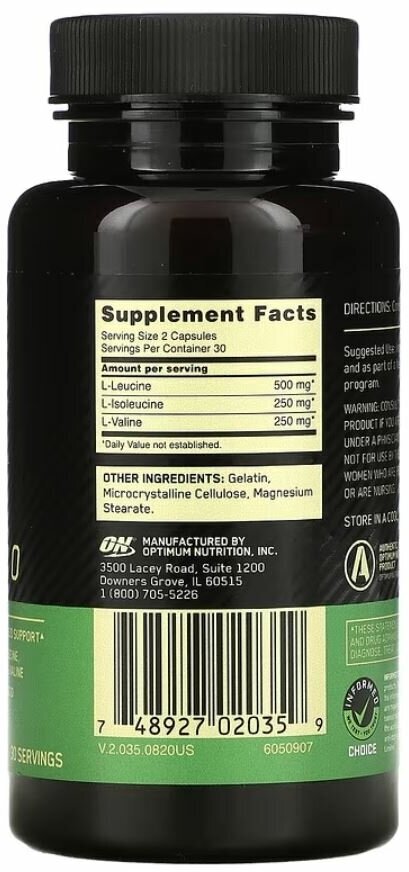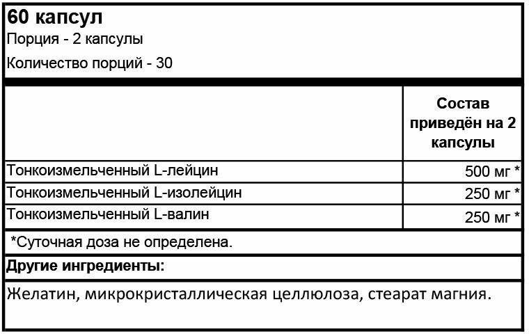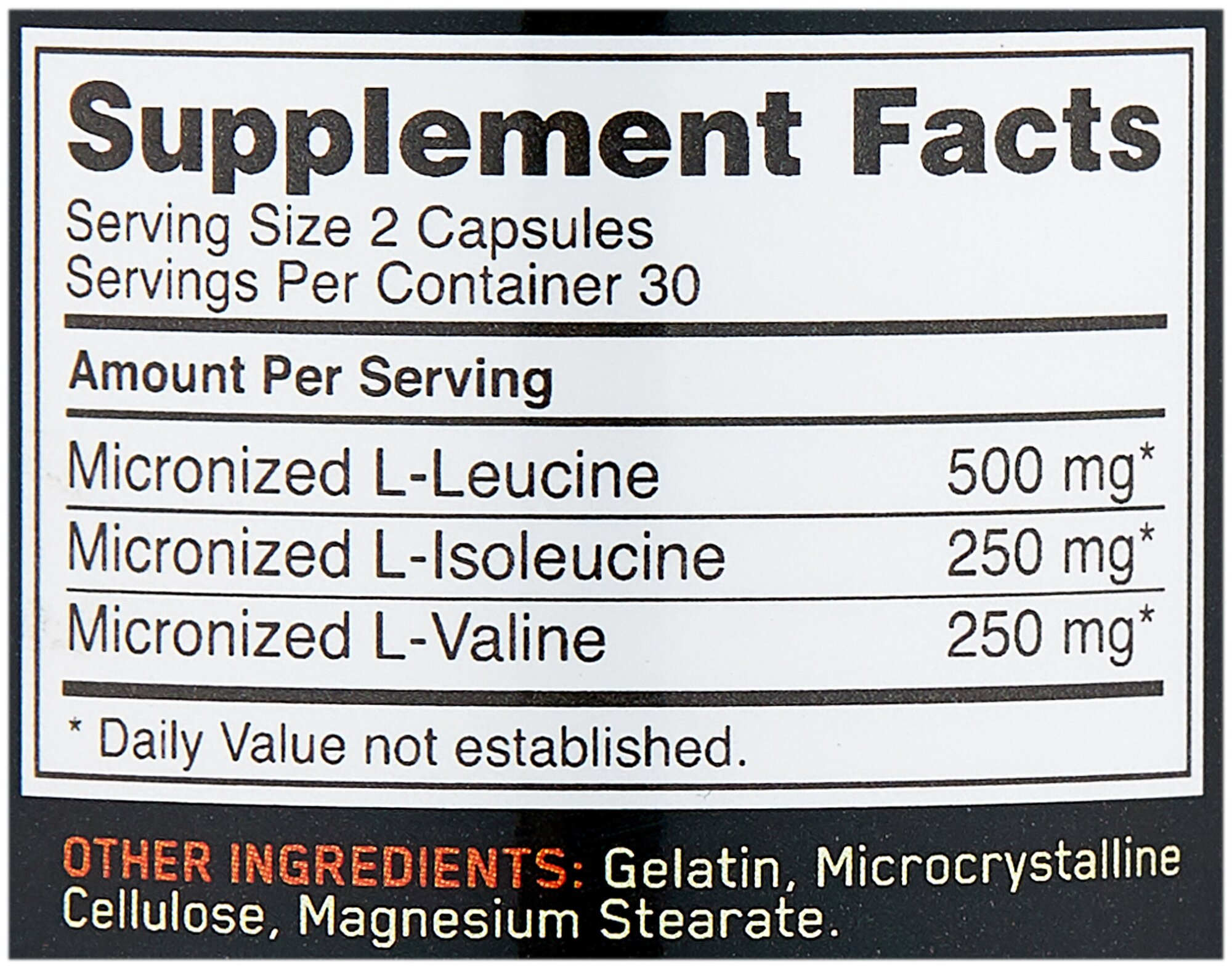 Additional Information: 1 serving 2 capsules contains: L-leucine - 500 mg, L-isoleucine - 250 mg, L-valine - 250 mg; Serving Size Per Capsule/Tablet: 2; Directions: Take 2 capsules between meals, 35-45 minutes before training and/or immediately after exercise.